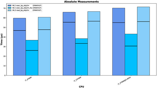 The values of the individual measurements from the various methods for every machine were aggregated with a little filtering to produce a common result plot for each machine. Now, we examine the corresponding result plot for the ThinkPad X390 (i7 8665U) machine—shown in Figure 6—as an example. All aggregated benchmark results for each machine are publicly available at https://github.com/lbeierlieb/bpbench_measurement_study/tree/f441dfda25e4ee7ef07c122fa3efa15fa1eabfab/plots/machines (accessed on 9 September 2025).