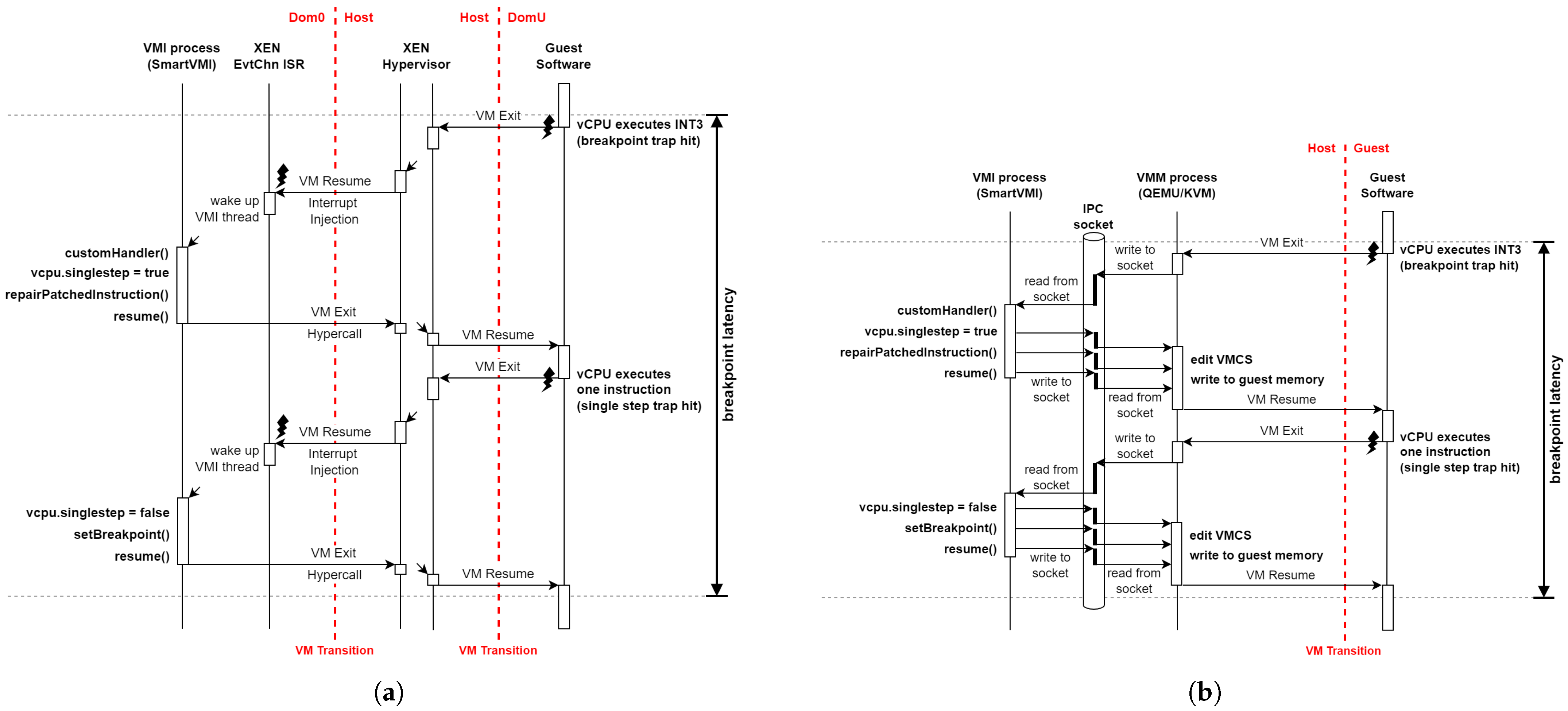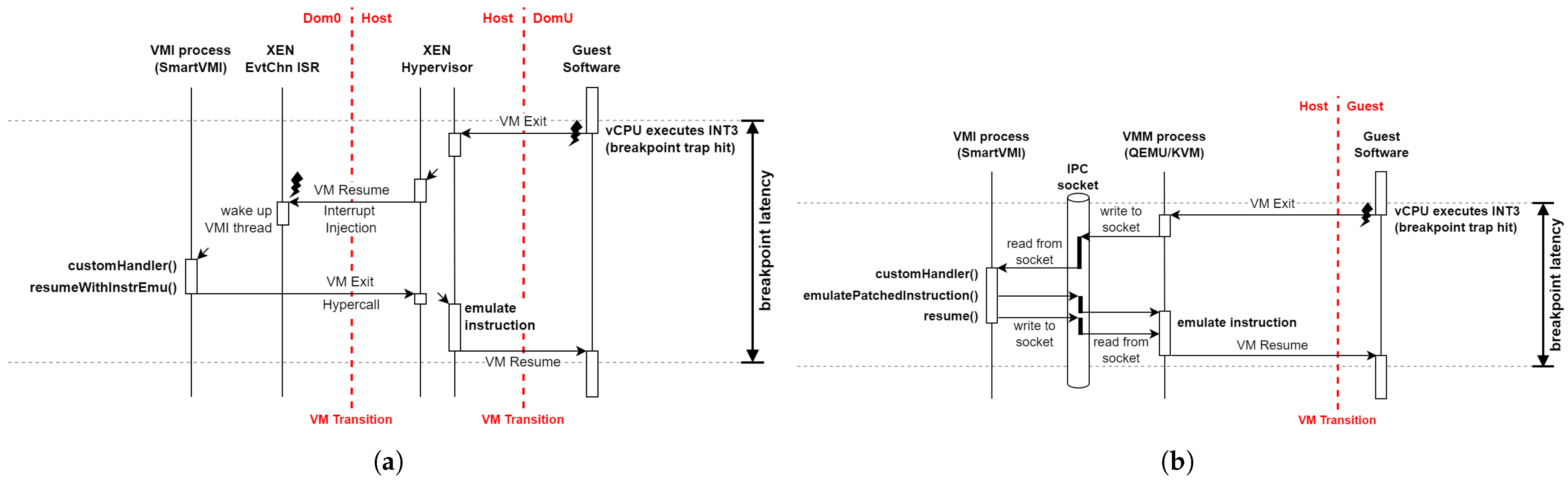 https://github.com/GDATASoftwareAG/smartvmi/issues/140#issue-2046303351, accessed on 2 September 2025). SmartVMI’s instruction emulation, which we implemented for XEN, does not directly work with KVM because LibVMI is missing the implementation for instruction emulation. However, SmartVMI’s read emulation is functional with KVM, so we hope the required changes in LibVMI and KVMI are small and that we will be able to implement instruction-emulation-based breakpoint handling for KVM soon.