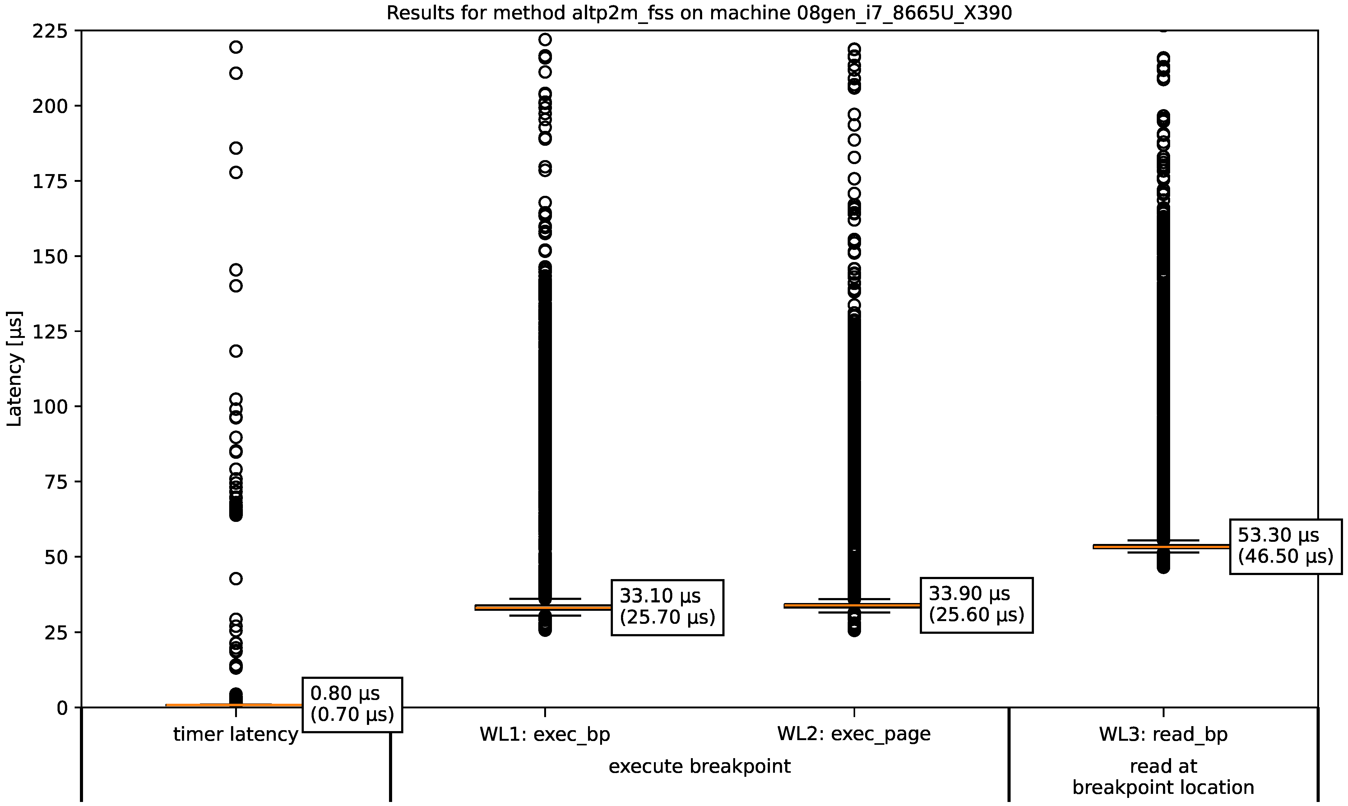 The boxes indicate the InterQuartile Range (IQR), enclosing the middle 50% of the values. An orange line inside each box marks the median, which is also noted numerically to the right. The whiskers extend to the smallest and largest values within 1.5 times the IQR, while any values outside are plotted individually as outliers (circles). In all boxplots, very large outliers are omitted from the plot because they exceed the scale by several orders of magnitude. These stem from interruptions or context switches inside the Windows VM that pause bpbench’s execution. Nevertheless, all values, including outliers, are used to compute the IQR and median. Next to each box, the median and the minimum value (in brackets) are displayed, with the latter representing the best-case technical limit of the respective method.