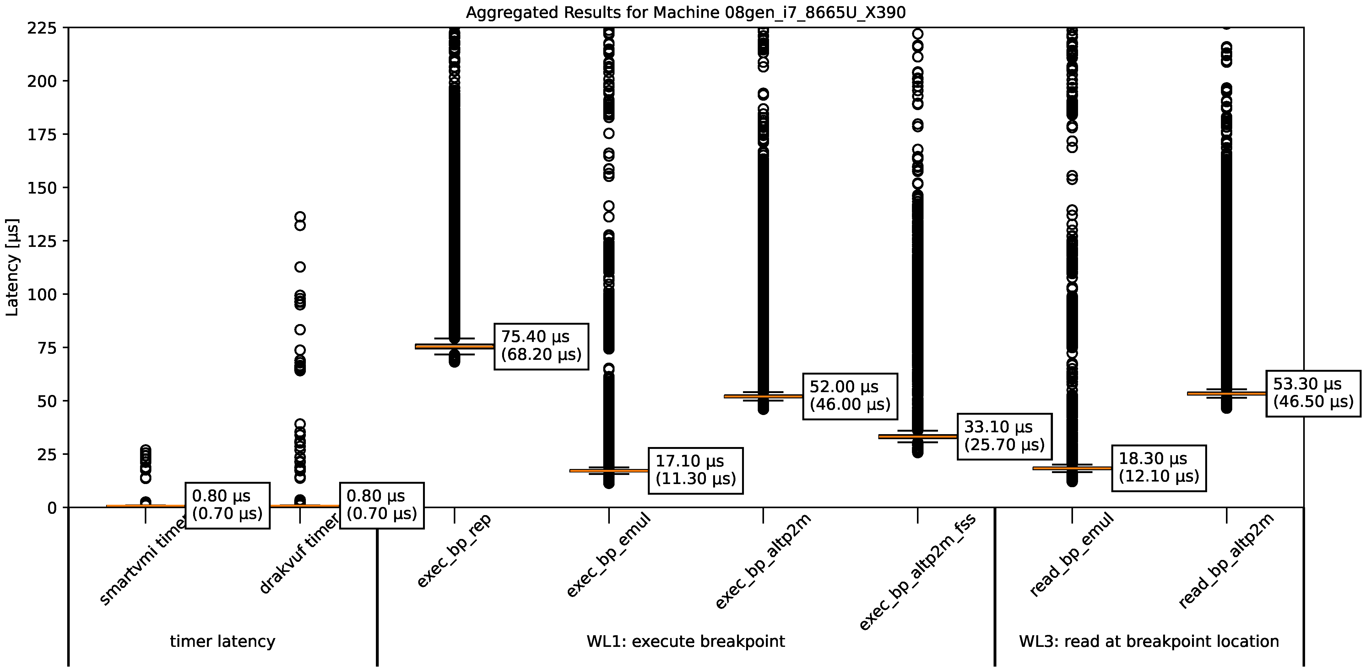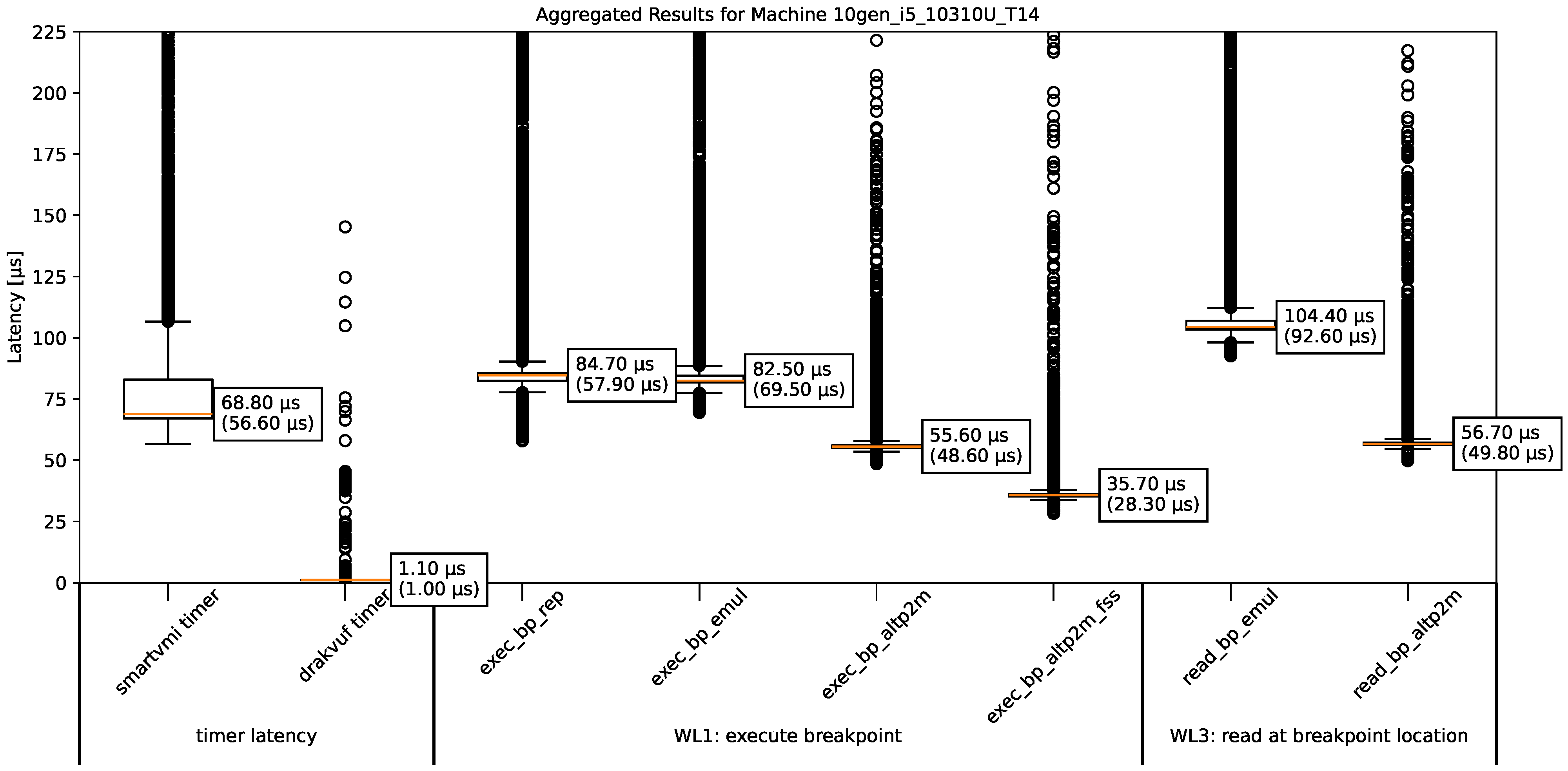 A further observation is that the timer overhead (column 1) is generally very low, typically between 0.5 µs and 2.5 µs on standard CPU cores or performance cores. An exception occurs on the ThinkPad L14 (i7-1265U), where the Windows VM must run on an efficiency core, resulting in slightly higher values. For every bpbench run and method, the timer overhead is remeasured. The values of the two DRAKVUF runs (altp2m, altp2m_fss) and the two SmartVMI runs (instr_rep, instr_emul) are always very close to each other, but differences exist between DRAKVUF and SmartVMI. Therefore, timer overhead values can be merged only per VMI application and per system.
