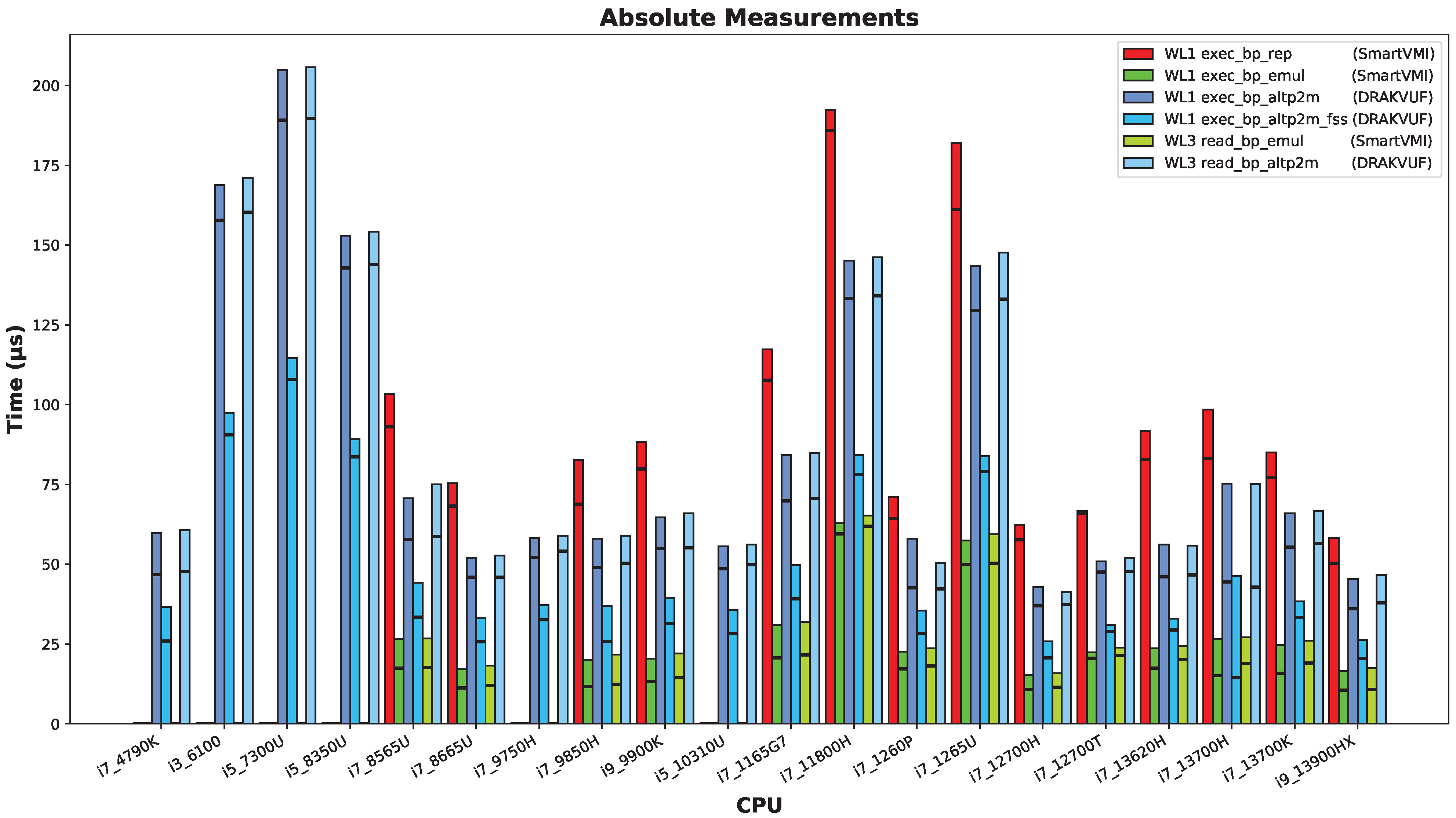 Each time bpbench is run, all four workloads are executed. This results in four measurement values for breakpoint-hiding mechanisms (WL3, WL4) on each machine with the tested methods. Since only two breakpoint-hiding mechanisms exist in our experiments with the selected VMI software, some methods appear twice. We present only the read_bp_altp2m, since DRAKVUF with and without fast-singlestep mode produces identical results (fast-single-step is not implemented for breakpoint hiding). Similarly, only read_bp_emul is shown, because this is the only breakpoint-hiding method that is implemented in SmartVMI. A breakpoint-hiding mechanism using instruction repair does not exist.