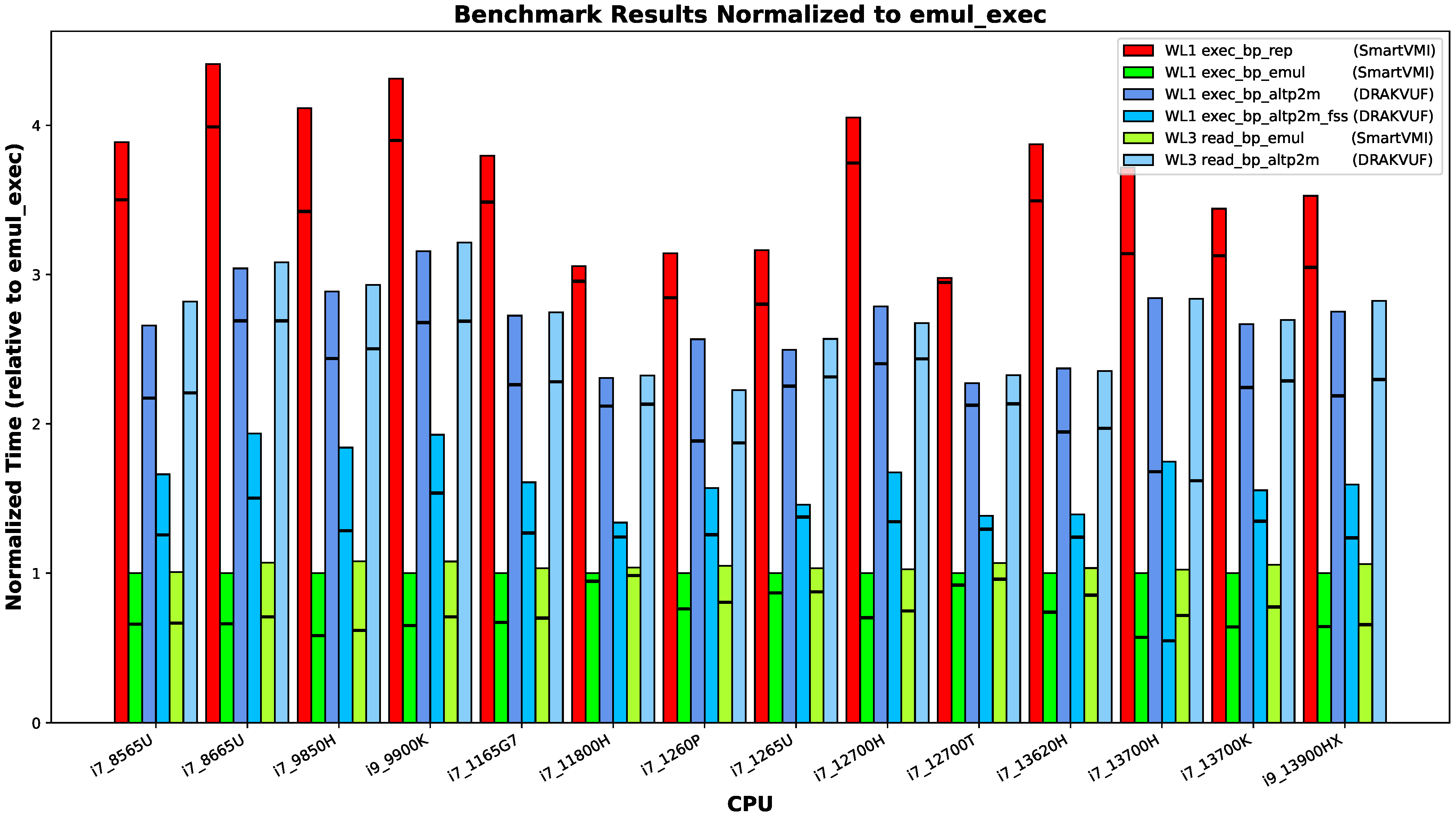 16], we presented the existing implementations for hyper breakpoints, discussing their strengths, limitations, and trade-offs. Furthermore, we proposed and implemented a benchmark for x86_64 breakpoints that is suitable for measuring the execution performance of a VMI-based breakpoint implementation. This paper differs from our earlier work mainly because now we are able to benchmark and compare all breakpoint implementations across different Intel Core CPU generations, whereas previously, only Instruction Emulation breakpoints could be tested on a single evaluation system with an Intel Core i5 7300U.