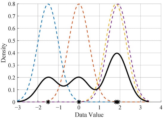This paper aims to modify the trend of the fitted curve by utilizing the spatial distribution of the data, so that the trend is not only to satisfy the minimum mean RER, but also to be closer to the trend direction in the data. Therefore, this study adopts Gaussian kernel density estimation to create a continuous probability density function, because of its non-parametric nature, that is, it does not make any specific assumptions about the underlying distribution of the data. This function leverages the normal distribution’s probability density to smoothly disperse the influence of each data point to surrounding areas, with closer points receiving higher weights, as shown in Figure 3. Ultimately, by integrating discrete data values with spatial distance relationships through Gaussian kernel density estimation, the spatial density assessment is completed.