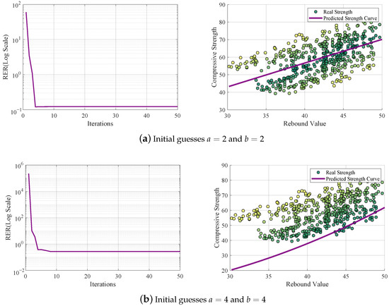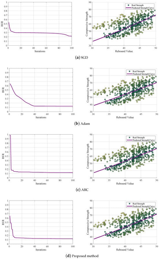Fitting the transformation formula curve for predicting concrete compressive strength can be regarded as a regression problem, where the goal is to establish a functional relationship between rebound values and strength. Conventional regression models, such as linear or polynomial regression, are widely used for this purpose; however, they may struggle to accurately capture complex, nonlinear relationships in heterogeneous or sparsely distributed data [22,23]. Currently, the determination of parameters for the transformation formula typically relies on the least squares method. While effective for simple linear problems, the least squares method often fails to provide satisfactory solutions for nonlinear or highly variable cases. From another perspective, the parameter identification process in the transformation formula can be naturally formulated as a real-valued optimization problem. This observation motivates the use of optimization algorithms, particularly meta-heuristic algorithms, which leverage domain knowledge and guided search strategies to explore the solution space efficiently [32]. Compared with traditional optimization methods, meta-heuristic algorithms are more flexible: they can handle a broader search range and impose no strict requirements on the form of the objective function [33,34,35,36]. As a result, they have been successfully applied in diverse complex environments, including economic dispatch problems [37], chip design [38], big data [39], image processing [36,40], robotics [41], feature selection [35], and energy management [42,43].