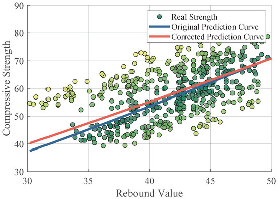 To sum up, predicting the compressive strength of concrete determined using NDT includes high levels of uncertainty [18,19,20,21]. Kocáb et al. have proposed that the use of general regression models for estimating compressive strength typically yields inaccurate results [22,23]. Therefore, they have introduced an innovative design for constructing a characteristic curve, which can be utilized to determine the stripping rebound number obtained from various types of rebound hammers. Mohammed et al. proposed using the rebound hammer (RH) and ultrasonic pulse velocity (UPV) to establish valid relationships [24]. With the advancement of machine learning, researchers have begun to employ end-to-end networks to predict compressive strength, maximizing the utilization of the collected data [25,26,27]. To address the variability in concrete properties, El-Mir et al. have proposed a solution using machine learning to provide unique predictive modeling [18]. Kazemi proposed a sophisticated artificial intelligence framework (ACO + ANN model) to simulate the compressive strength of concrete containing casting waste sand, with the aim of significantly reducing time-consuming laboratory tests and the need for skilled technical personnel [28,29]. Subsequently, the black-box nature of neural networks results in an ambiguous relationship between inputs and outputs, and it requires a substantial amount of data for training. In practical applications, this can increase the workload of on-site operators. Therefore, constructing a transformation formula and determining its parameters is the simplest and most efficient approach [30,31].