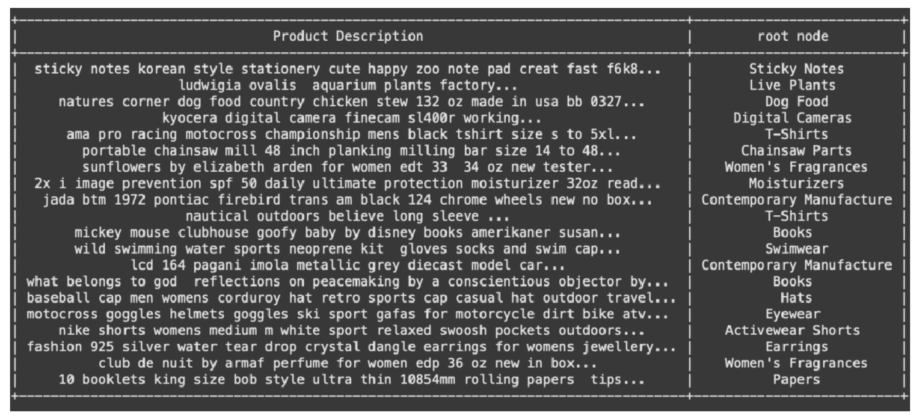 - Feature Selection: From the raw JSON data retrieved via the API, only the product title field was retained for its descriptive value. This field was designated as the ‘Product Description’. All other metadata (item IDs, pricing, seller details, condition, etc.) were discarded to focus the analysis on the textual content used for classification.