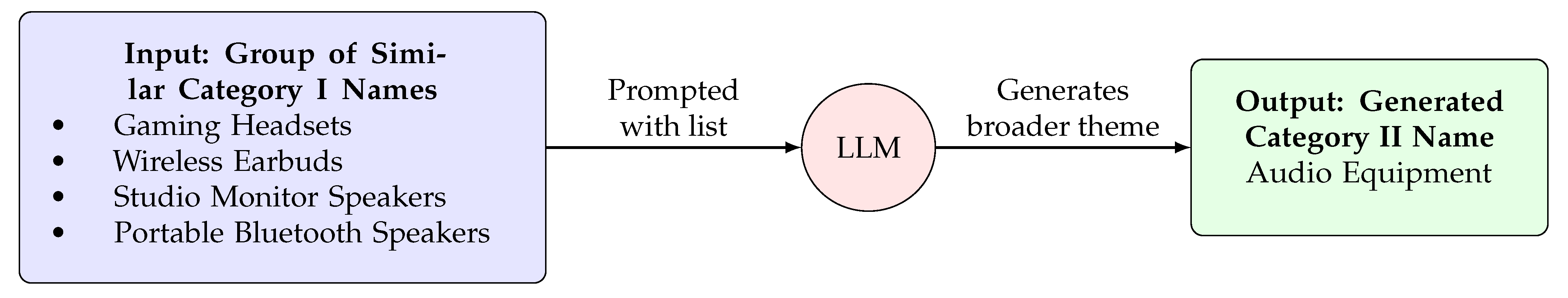- Level 2 (Category II) Generation: Once Category I names were generated for all initial clusters, the products were regrouped based on these assigned Category I labels. For each resulting group (containing multiple similar Category I names), a new prompt was formulated. This prompt presented the list of constituent Category I names as context and instructed the LLM to abstract a broader common theme, generating a suitable 2–3 word Category II name encompassing the characteristics of the input Category I names. This abstraction process is illustrated conceptually in Figure 7.