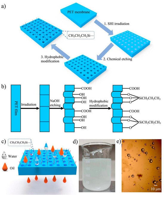 (a) Preparation of hydrophobic PET TeM: SHI irradiation, chemical etching, and surface modification with propyltrichlorosilane. (b) Overall preparation and modification process. (c) Schematic of oil/water separation. (d) Photograph of 9:1 oil/water emulsion. (e) Microscopic image of emulsion droplets (0.5–10 μm). Reproduced with permission from [80].