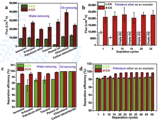 (a) Separation flux of commercial cellulose acetate (c-CA) and deacetylated cellulose acetate (d-CA) membranes for different oil/water mixtures. (b) Separation flux of petroleum ether/water over successive cycles for c-CA and d-CA membranes. (c) Separation efficiency of c-CA and d-CA membranes for various oil/water mixtures. (d) Separation efficiency of petroleum ether/water at different cycles for c-CA and d-CA membranes. Reproduced with permission from [82].