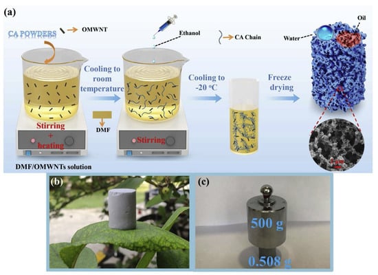 (a) Schematic diagram of preparation procedure of porous CA/OMWNTs monolith; Digital images of CA/OMWNTs-1.5% monolith (b) standing on a leaf and (c) supporting weight without deformation. Reproduced with permission from [86].