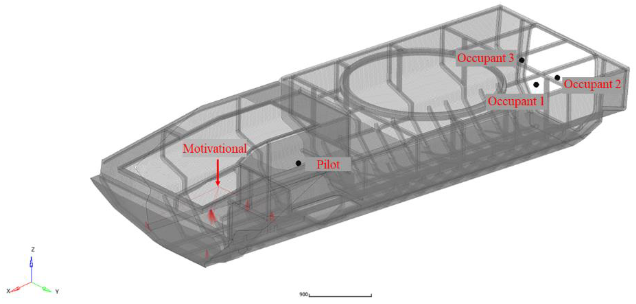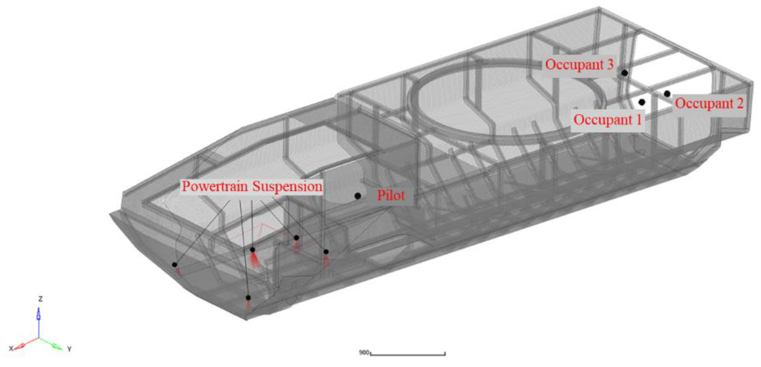 The finite element model was developed in HyperWorks/OptiStruct using CQUAD4 shell elements with an average mesh size of 20 mm, resulting in approximately 180,000 degrees of freedom (DOF). The suspension system was represented as flexible mount points, while the powertrain was simplified as a concentrated mass point with applied excitations. The body structure was assumed to be made of armor steel with density 7850 kg/m3, Young’s modulus 2.1 × 1011 Pa, Poisson’s ratio 0.3, and damping ratio 0.015. These specifications ensure reproducibility of the model for future validation and benchmarking.