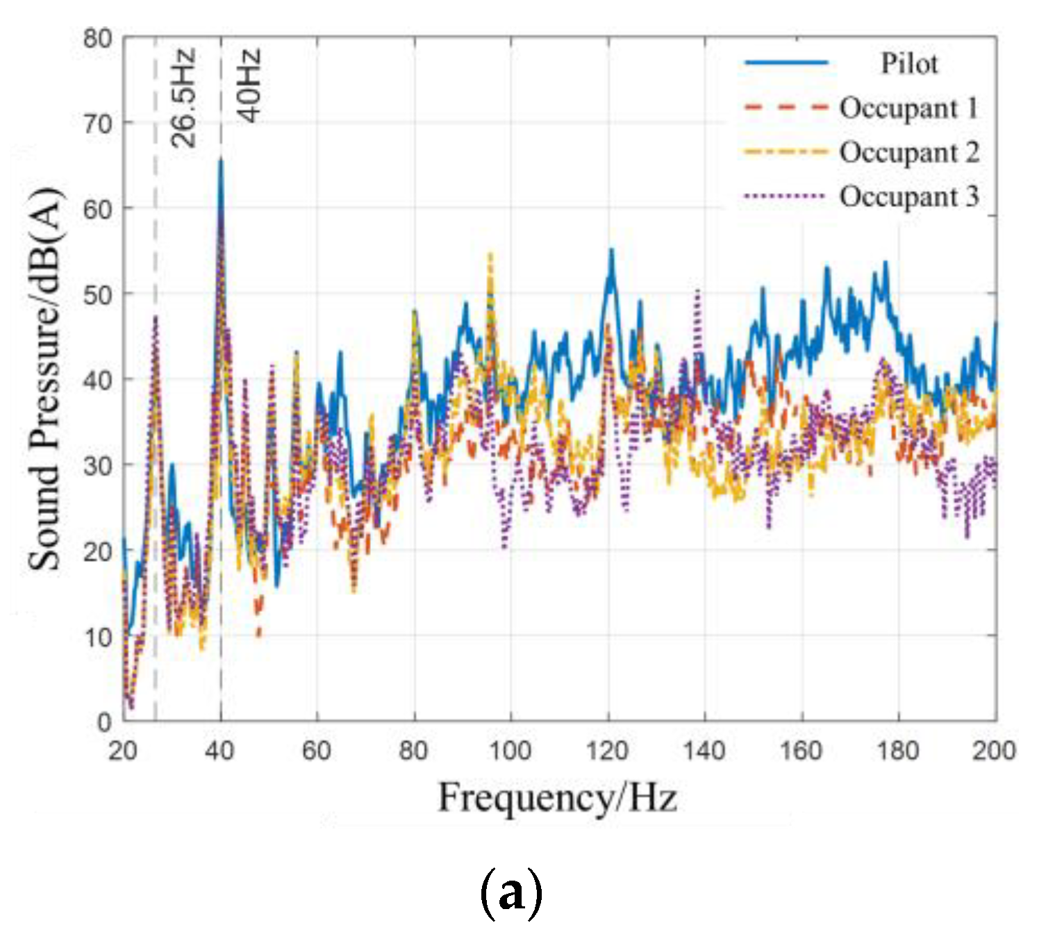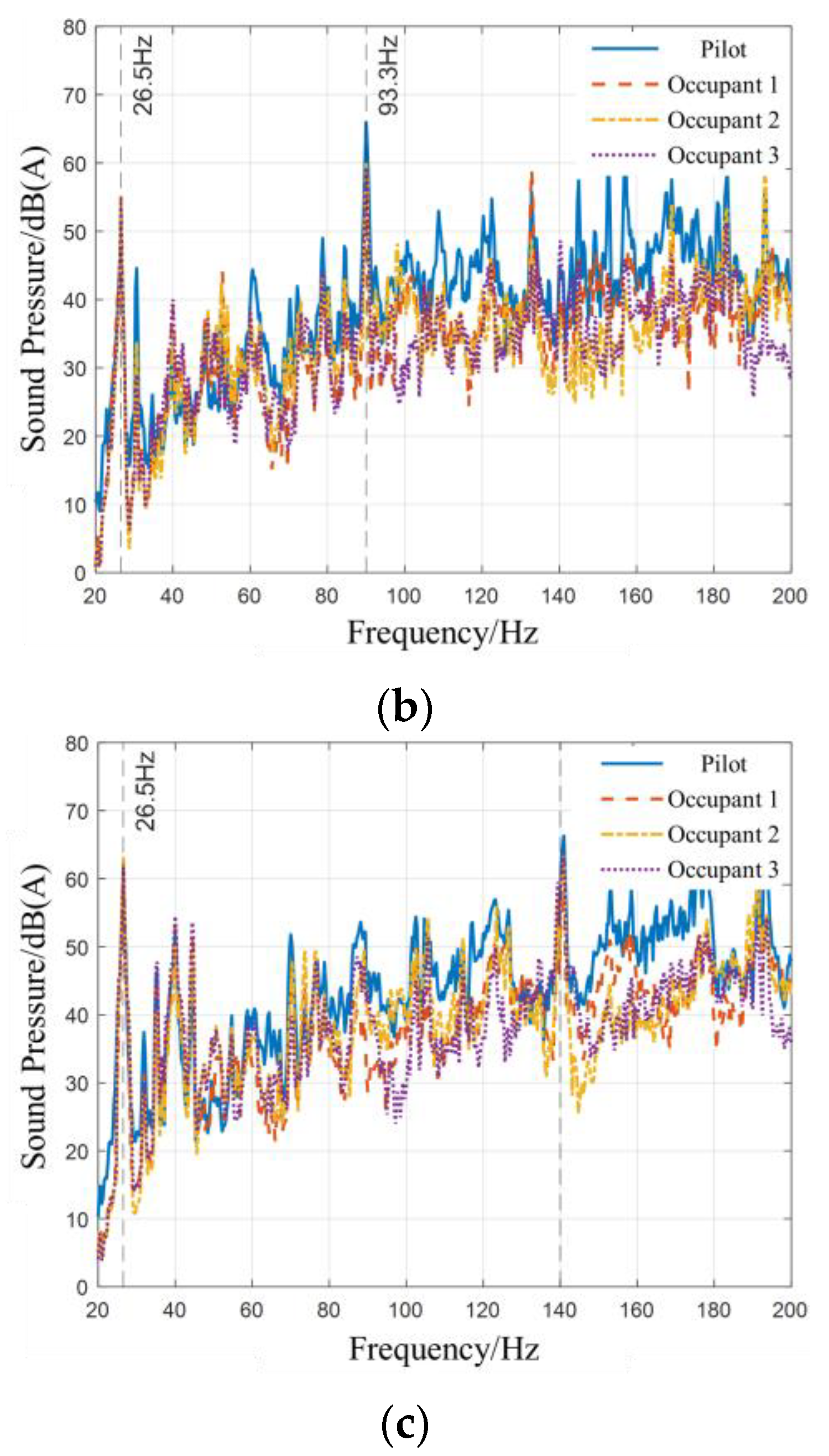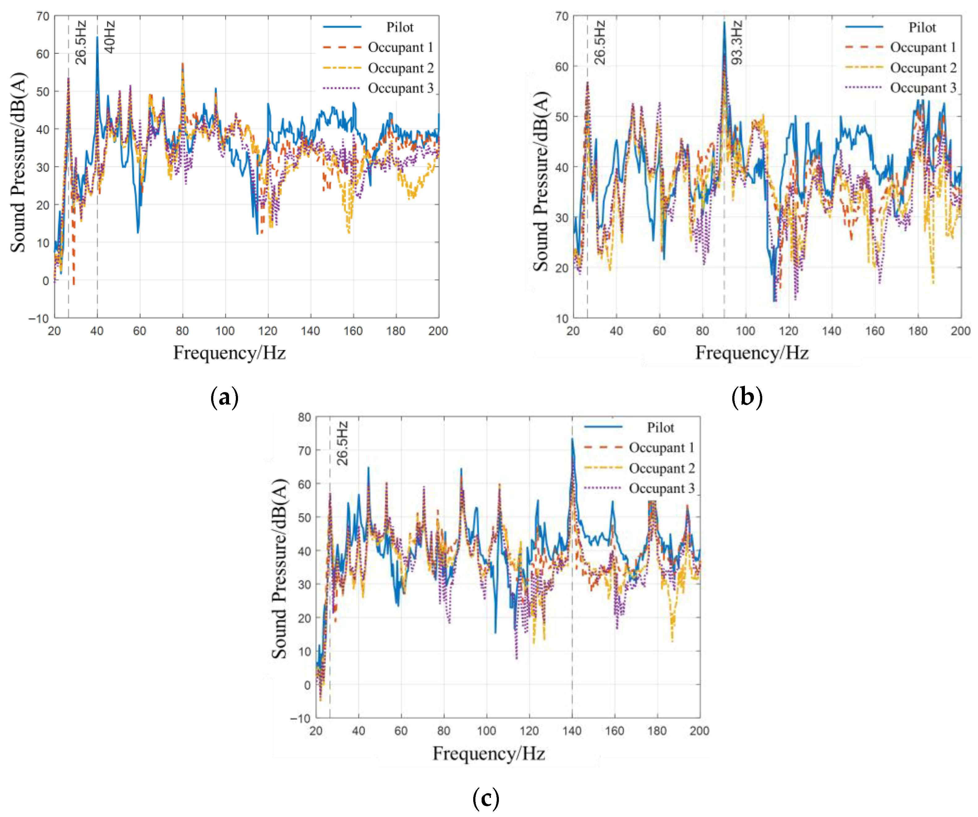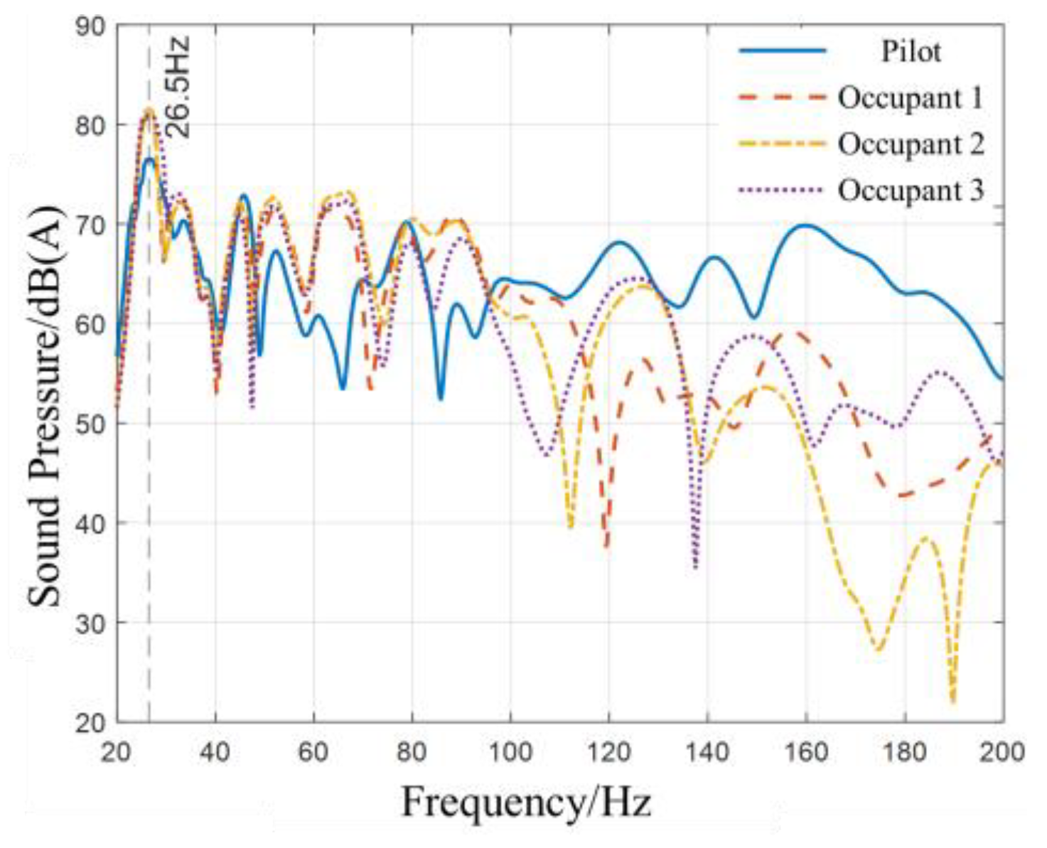 Section 3.3. Three typical working conditions are selected: idle speed (600 rpm), maximum torque (1400 rpm), and rated speed (2100 rpm). The analysis focuses on 4 core response points: the driver’s ear (Measuring Point ①), Passenger 1’s ear (Measuring Point ②), Passenger 2’s ear (Measuring Point ③), and Passenger 3’s ear (Measuring Point ④), with emphasis on data in the low-frequency range of 20–200 Hz. Among them, the characteristic frequency points are selected as follows: 26.5 Hz (system’s inherent coupling frequency), 40 Hz (fourth-order excitation frequency of the engine at idle speed), 93.3 Hz (excitation frequency at maximum torque speed), and 140 Hz (excitation frequency at rated speed). For the full-frequency band analysis, a frequency resolution of 1 Hz is used, resulting in a total of 181 data points.