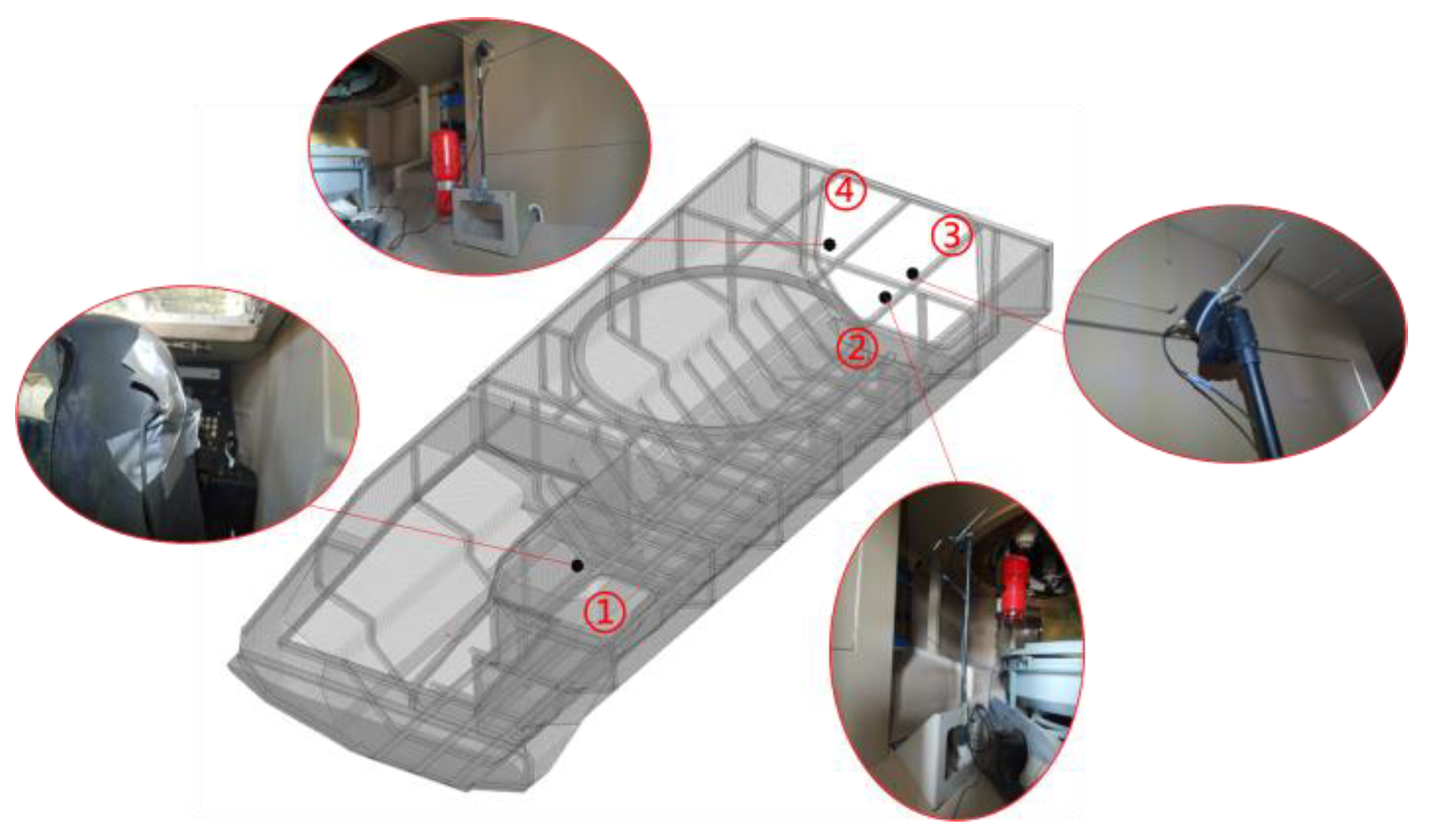 Figure 7. Point ① is positioned near the driver’s right ear, adjacent to the right side of the driver’s seat. Points ②, ③, and ④ are located near the right ears of the respective occupants. Since occupant seats were uninstalled during testing, transducers were mounted on rigid metal rods fixed 700 mm above the nominal seat plane, maintaining >150 mm clearance from body panels.