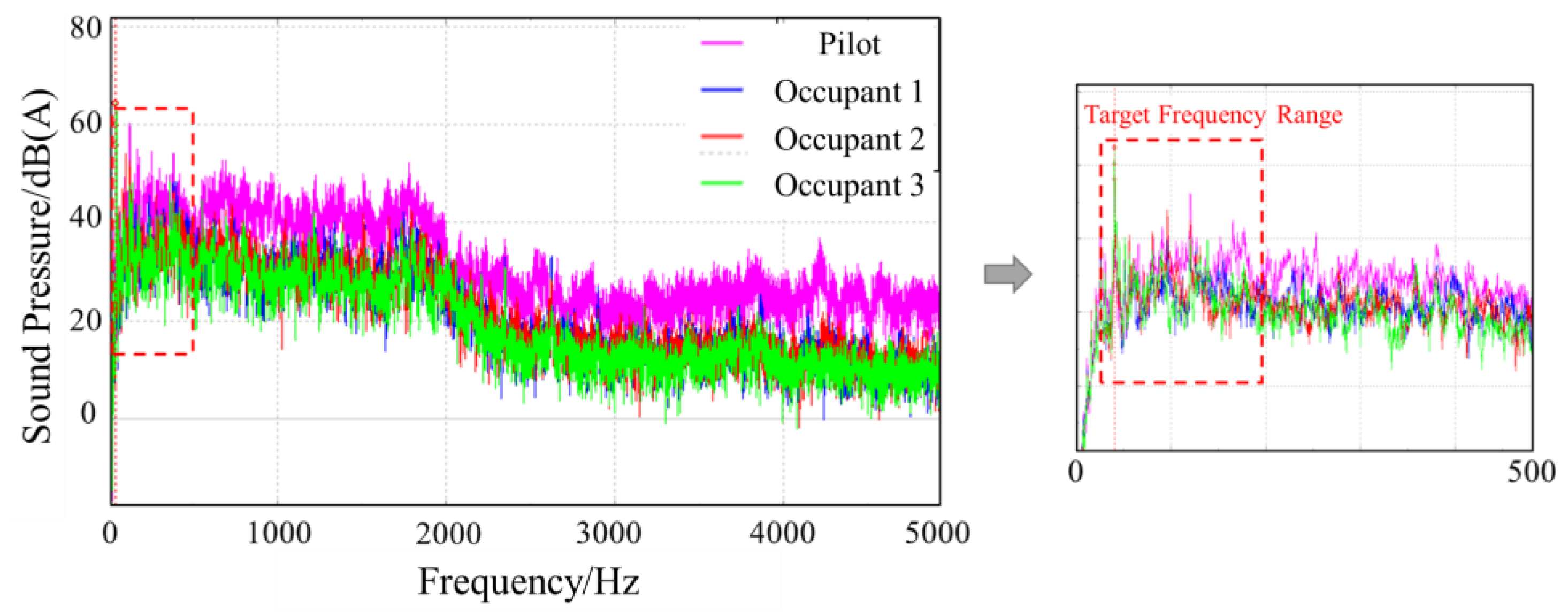 Four acoustic pressure measurement points were selected for structural noise sampling: at the driver’s head and three occupant head positions. Sensor placement is detailed in