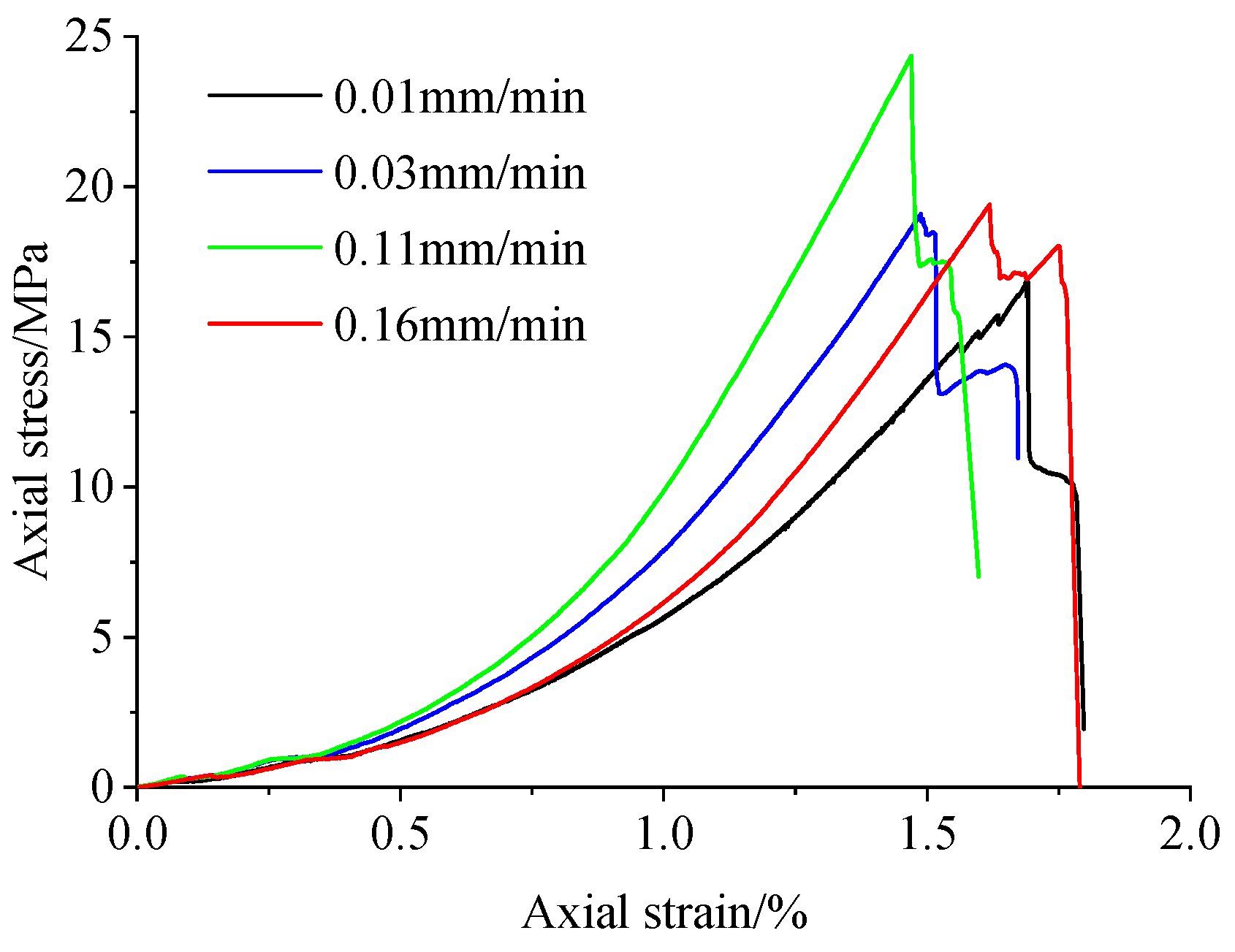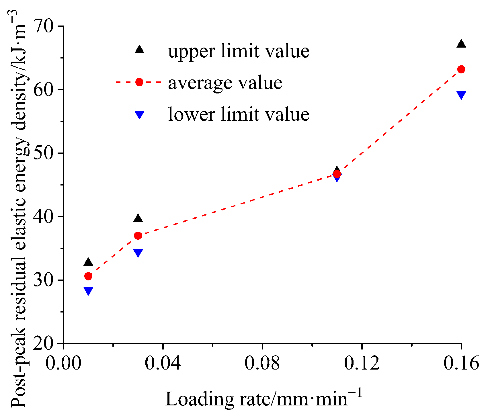 | Loading Rate /mm·min−1 | Compressive Strength/MPa | Elastic Modulus/GPa | Post-Peak Residual Elastic Energy Density /kJ·m−3 |