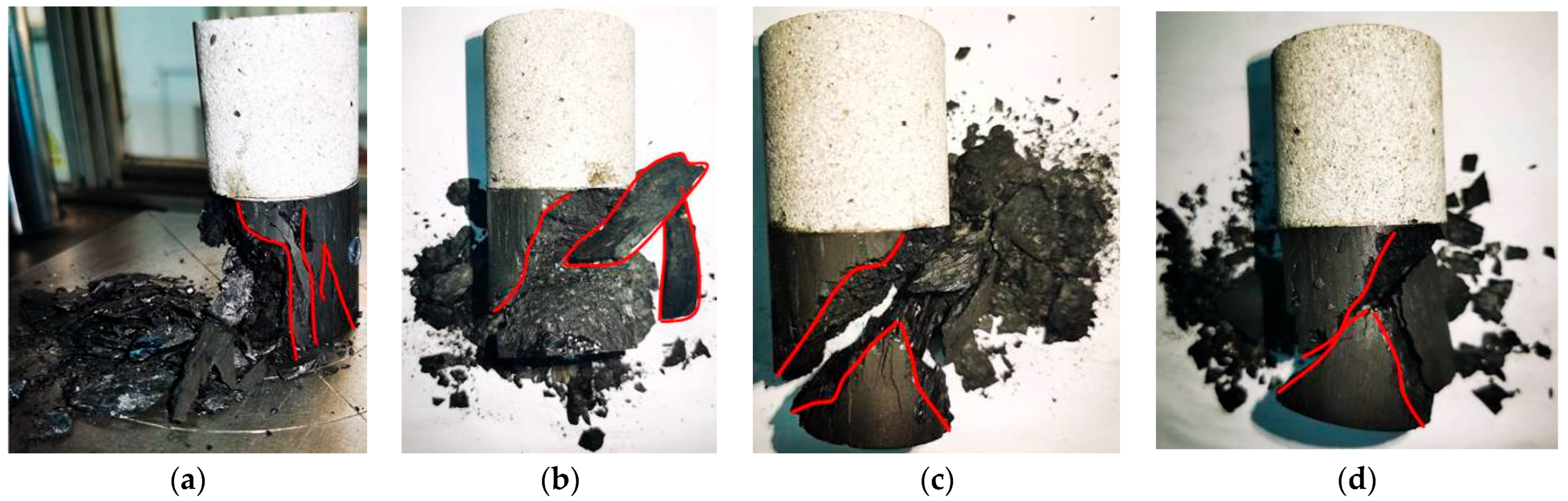 - Liu, X.W.; Chen, H.X.; Liu, B.; Deng, W.; Liu, Q.S.; Zhang, Z.Z. Experimental and numerical study on failure characteristics and mechanism of coal under different quasi-static loading rates. Theor. Appl. Fract. Mech. 2022, 121, 103478. [Google Scholar] [CrossRef]