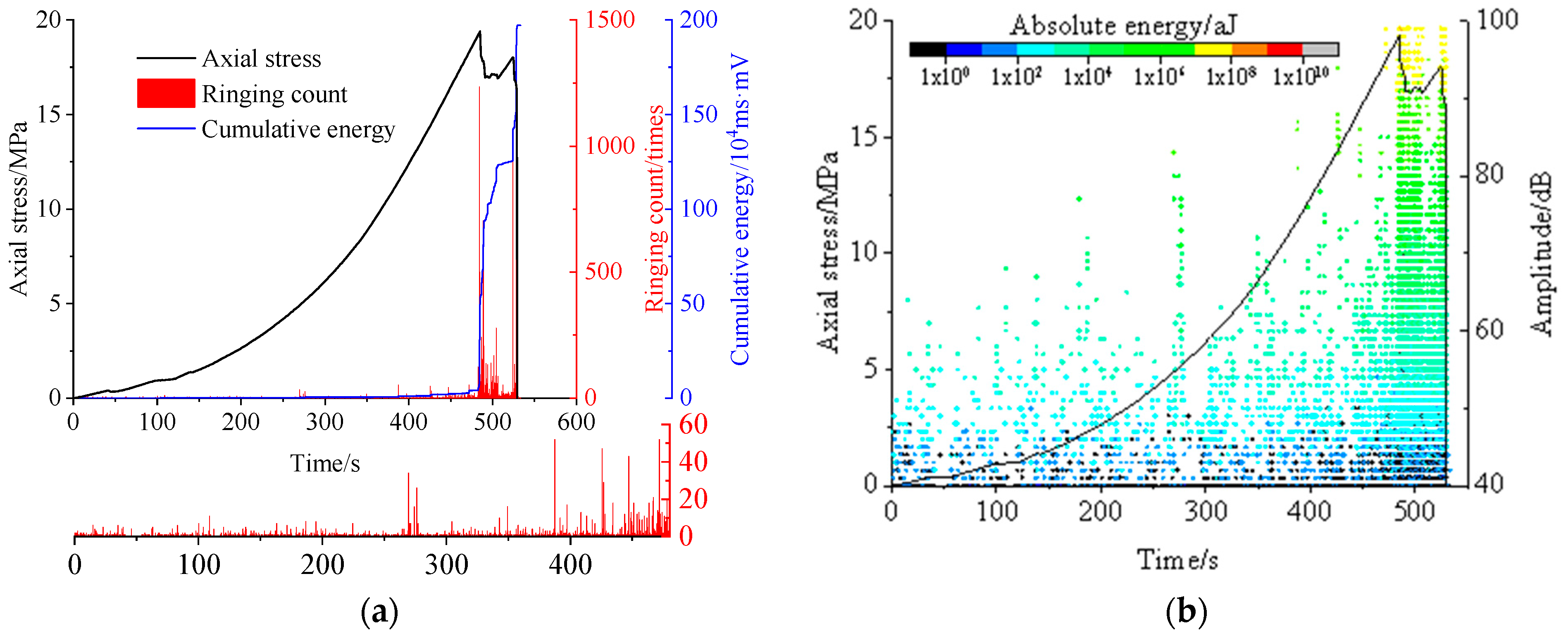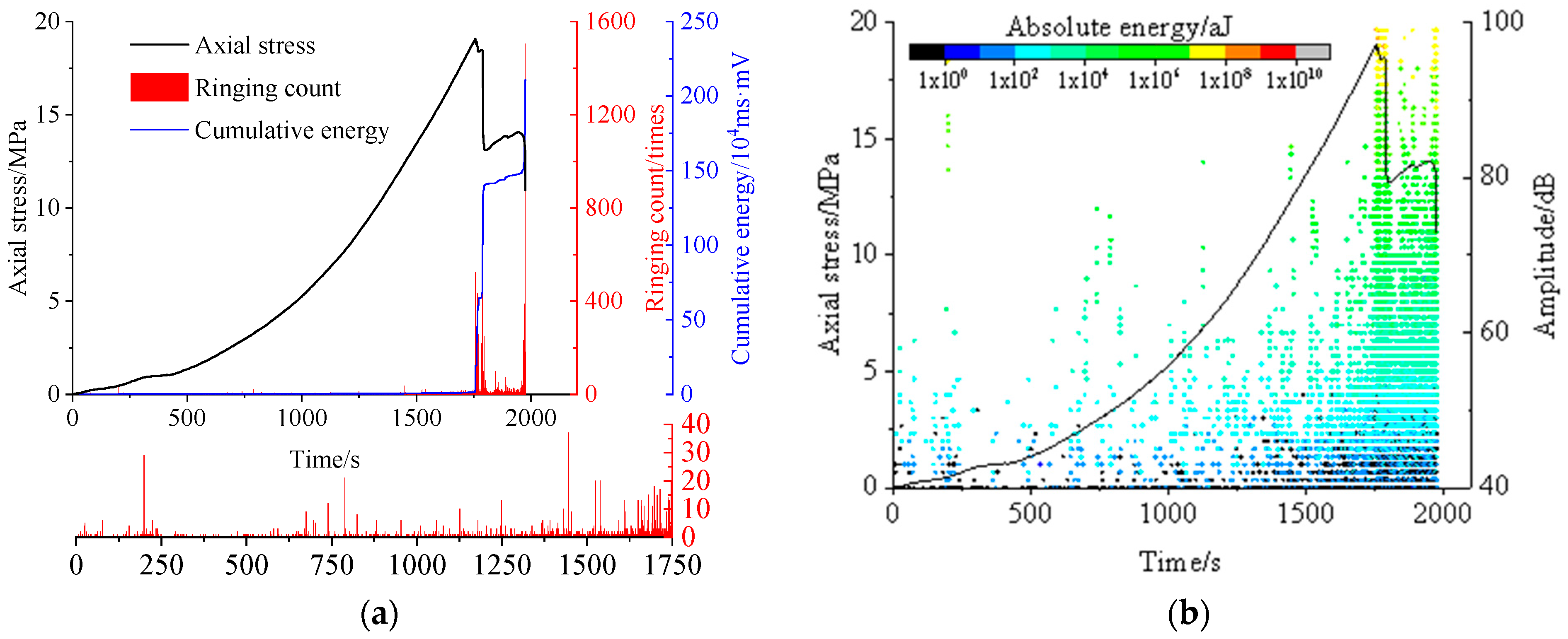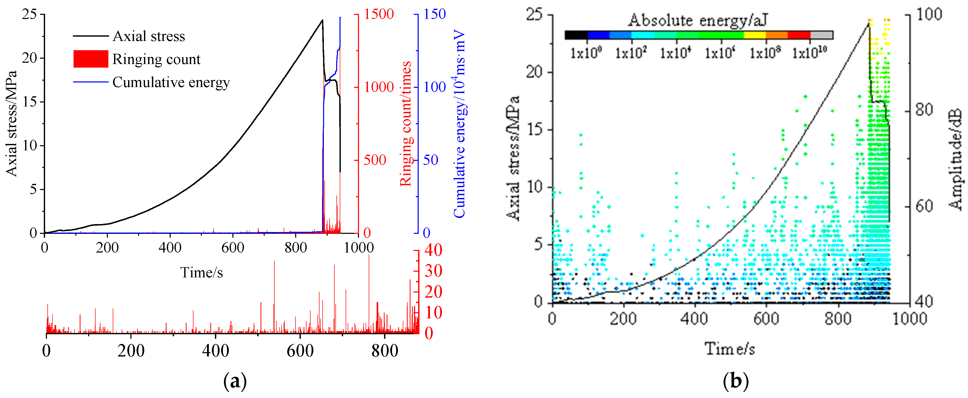 - Liu, B.; Zhao, Y.X.; Hua, X.Z.; Ling, C.W.; Wang, X.L. Failure characteristic and acoustic emission spatio-temporal evolution of coal under different cyclic loading rates. Energy Sci. Eng. 2023, 11, 2039–2051. [Google Scholar] [CrossRef]