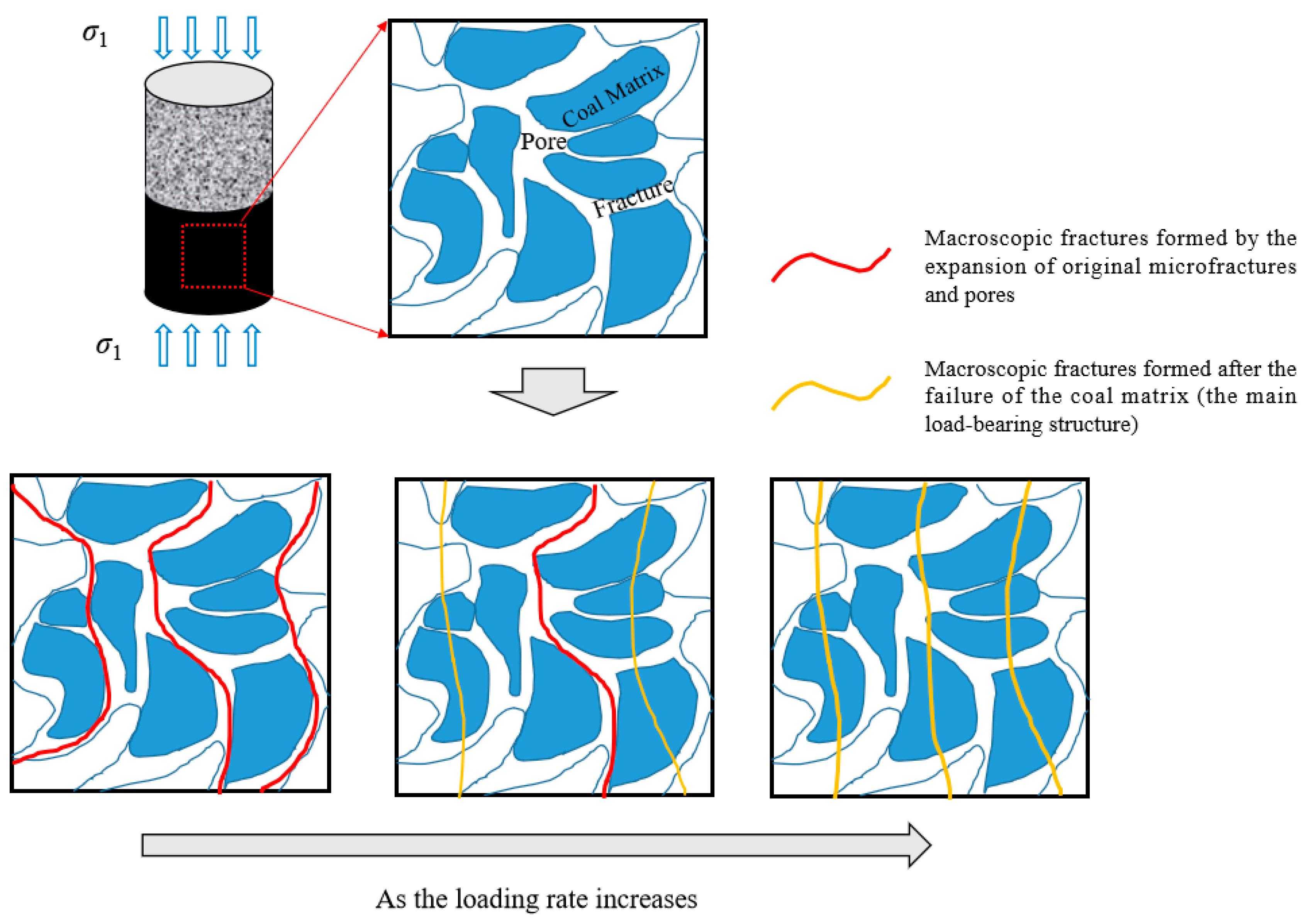 - The proposed mechanism is consistent with the observed results. In the case of high-speed advancing, the higher loading rate leads to insufficient development and propagation of fractures. The coal matrix, acting as a framework, exerts a significant load-bearing effect. As a result, the macroscopic mechanical properties exhibit increased compressive strength, larger elastic modulus, low energy dissipation, high energy accumulation, substantial energy release during failure, and a strong impact failure effect.