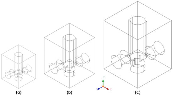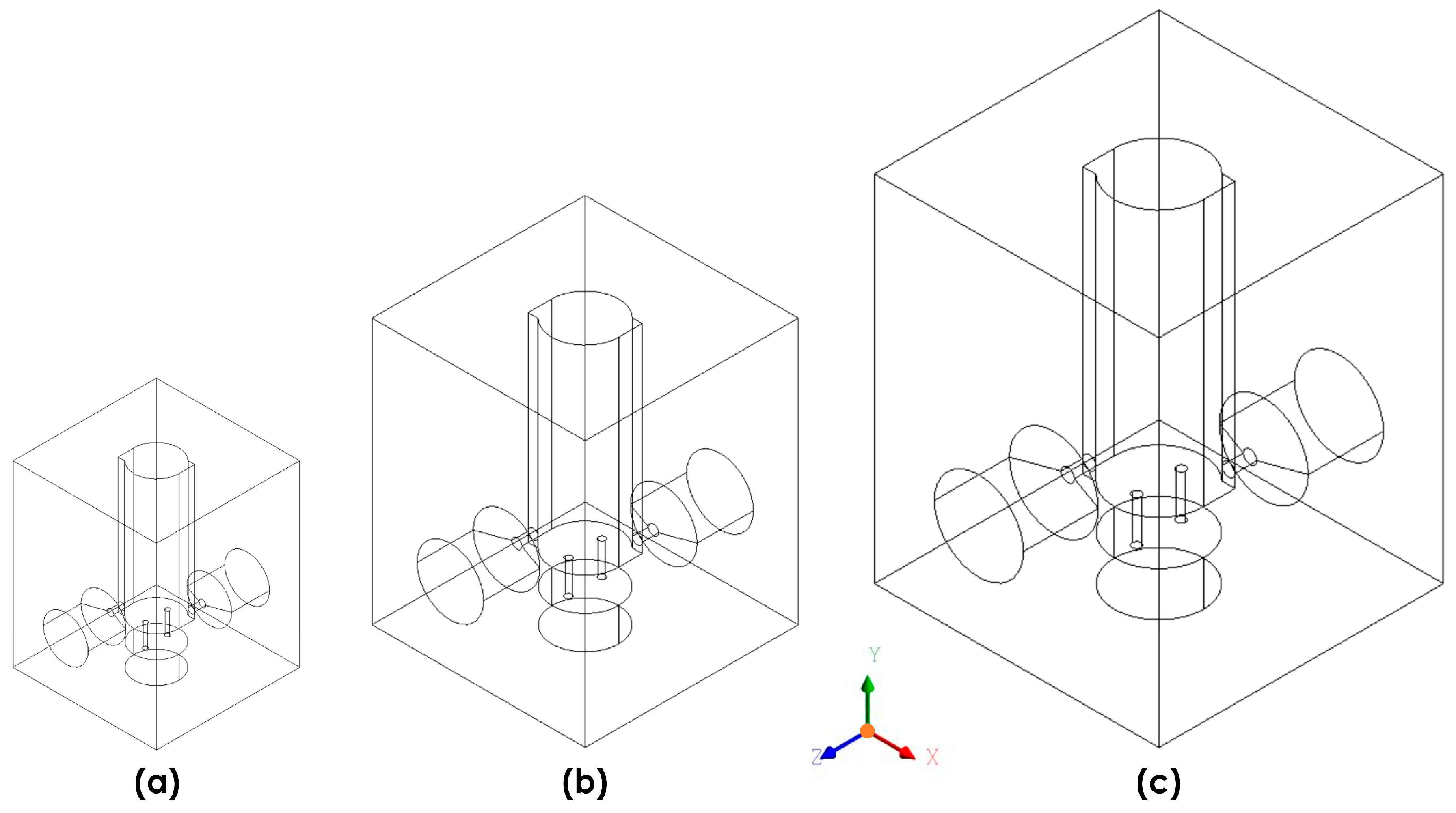 Multi-scale meso combustor configurations: (a) Model X, d’FI = 1 mm, (b) Model A, d’FI = 1.5 mm, and (c) Model B, d’FI = 2.0 mm.