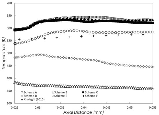 The solution is converged when the residuals of each governing equation at consecutive iterations are less than 1 × 10−4, with the exception of the species and energy equations, which are converged at quantities less than 1 × 10−6. When this condition was met, the flow field variables achieved stable local values with respect to any number of iterations. Additionally, the temperature parameter monitors converged independently. Reacting flow cases were subjected to this convergence criterion. Figure 1 and Figure 2 illustrate the asymmetric vortex combustor design, while Table 1 provides the corresponding dimensions. A grid-independence study was conducted to quantify mesh-size effects; Scheme E provided the best accuracy, cost trade-off, and was therefore adopted for all cases to minimize computational time (Figure 3). This test was conducted with laminar flow and a counter-flow configuration, with inlet air and inlet fuel (methane) temperatures set at 300 K. Six (6) sets of meshes were generated using tetrahedral elements with SA = 649,207 nodes, SB = 337,918 nodes, SC = 222,096 nodes, SD = 151,567 nodes, SE = 113,133 nodes, and SF = 90,424 nodes. Results from the grid independence observations, Scheme E, which comprises 113,133 nodes, were determined to provide the optimal equilibrium between computational cost and accuracy among the evaluated schemes. Based on the rightmost axial station (x ≈ 0.055 mm) with T ≈ 570 K as reference, Scheme E predicts ≈ 585 K and an absolute error of ≈ 2.6%, the smallest among all schemes, and it is also close to the previous work from [16]. Hence, Scheme E is the preferred choice for validation and production runs, offering the best agreement with the benchmark while avoiding the systematic over-/under-prediction seen elsewhere. The differences in key flow parameters between Scheme E and finer meshes (Scheme A and Scheme B) were negligible, with variations in core temperature and velocity magnitudes remaining below 1.5%. This level of agreement validates the numerical fidelity of the mesh scheme and confirms its suitability for use in all subsequent simulations. All computational domains included both fluid and solid regions of the meso-scale combustor. A computer with a Core i9 CPU and 16 GB of RAM was used to perform these computations.