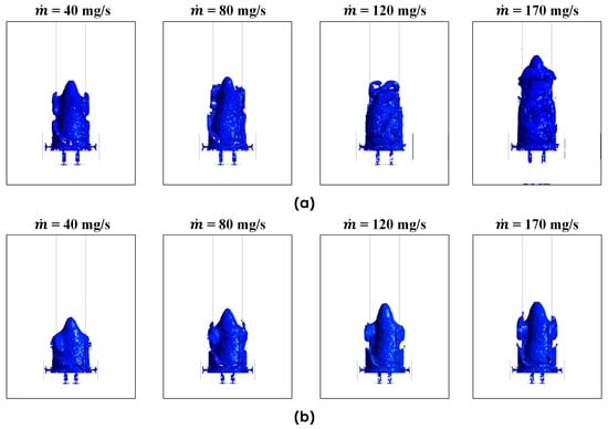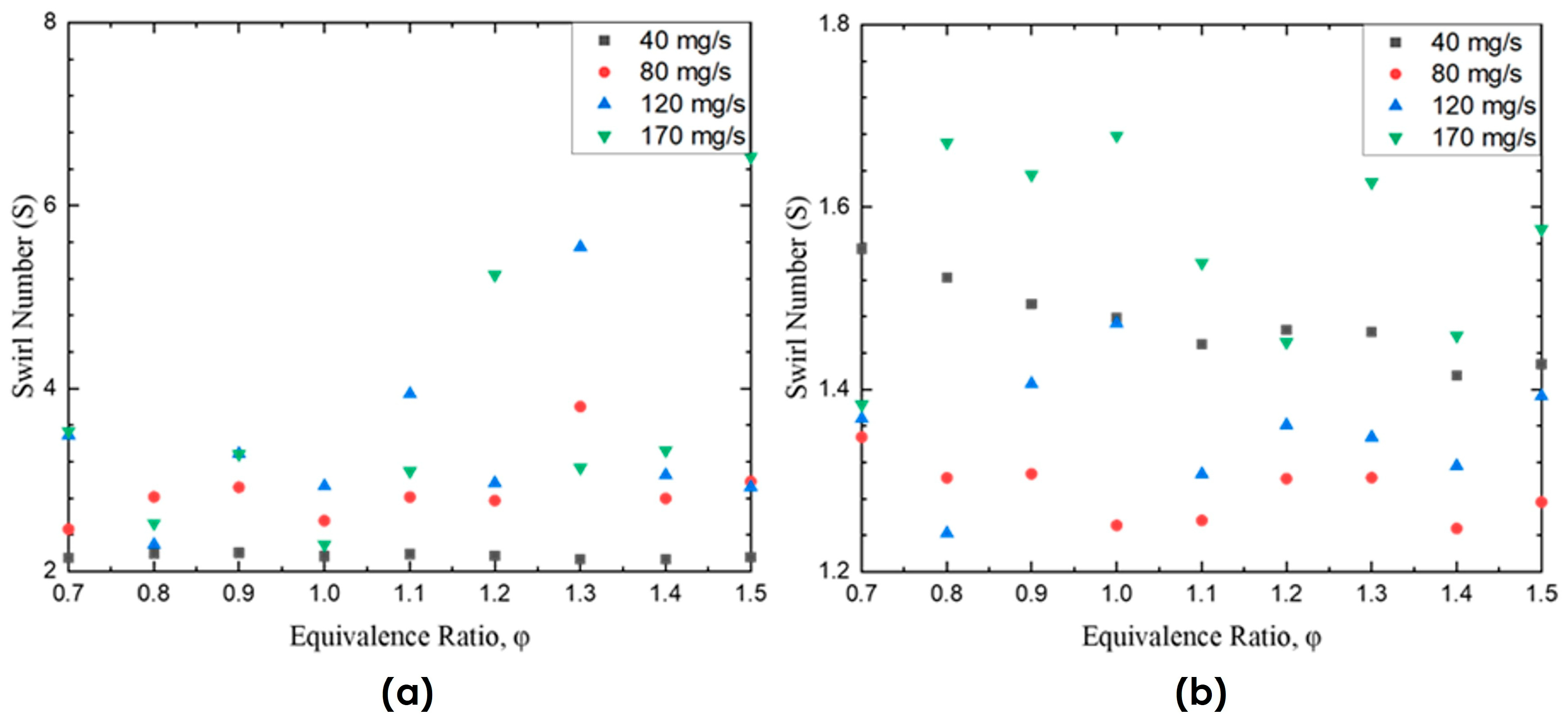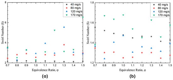In Model A, the swirl number increases significantly with mass flow rate, especially beyond 120 mg/s. A sharp rise is evident at equivalence ratios greater than ϕ = 1.1, culminating in a peak swirl number of approximately 6.5 at ϕ = 1.5 under the highest flow rate. This trend indicates a strong coupling between flow rate and vortex strength, with richer mixtures contributing to intensified centrifugal and shear forces. At lower mass flow rates (40–80 mg/s), however, the swirl number remains relatively constant, suggesting that the influence of the equivalence ratio on vortex behavior is minimal under low-flow conditions. In contrast, Model B exhibits a markedly different pattern. Across all tested conditions, the swirl number remains relatively stable, ranging narrowly between 1.2 and 1.6. Even at the highest mass flow rate (170 mg/s), variations in equivalence ratio produce only marginal changes in swirl number. This stability reflects an inherent insensitivity to mixture richness, likely due to the geometric or hydraulic design features of Model B that limit vortex amplification.