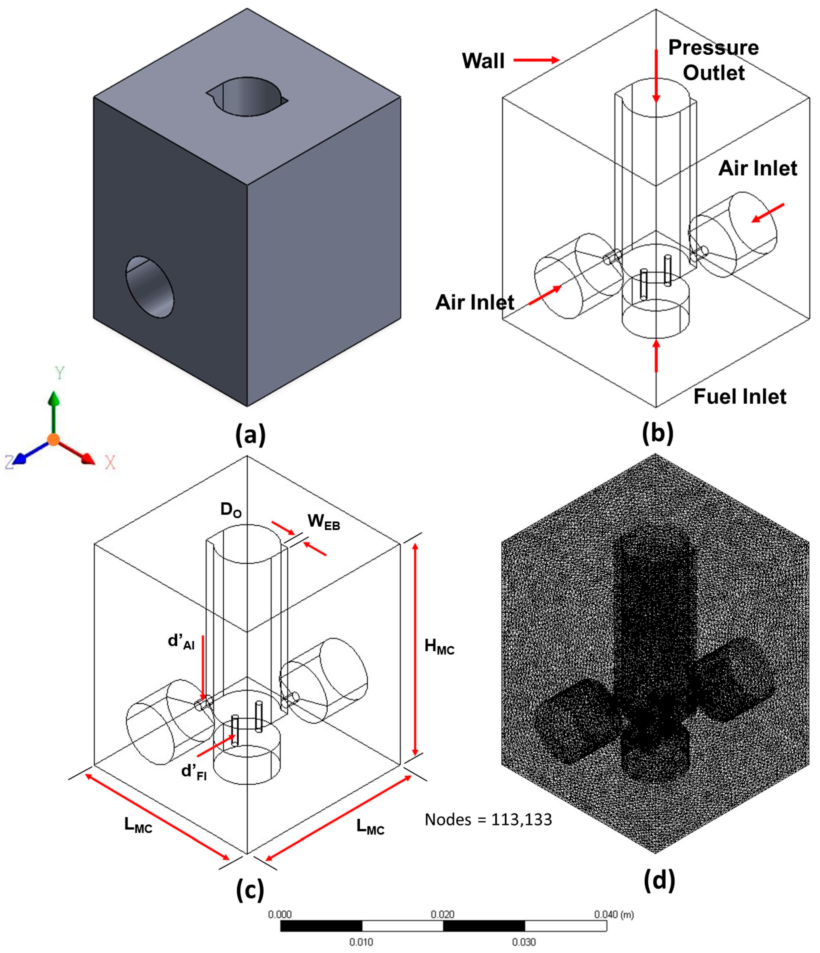 Description of Meso-Combustor Model X, d’FI = 1.0 mm: (a) isometric view, (b) boundary conditions, (c) dimensions, and (d) meshing.