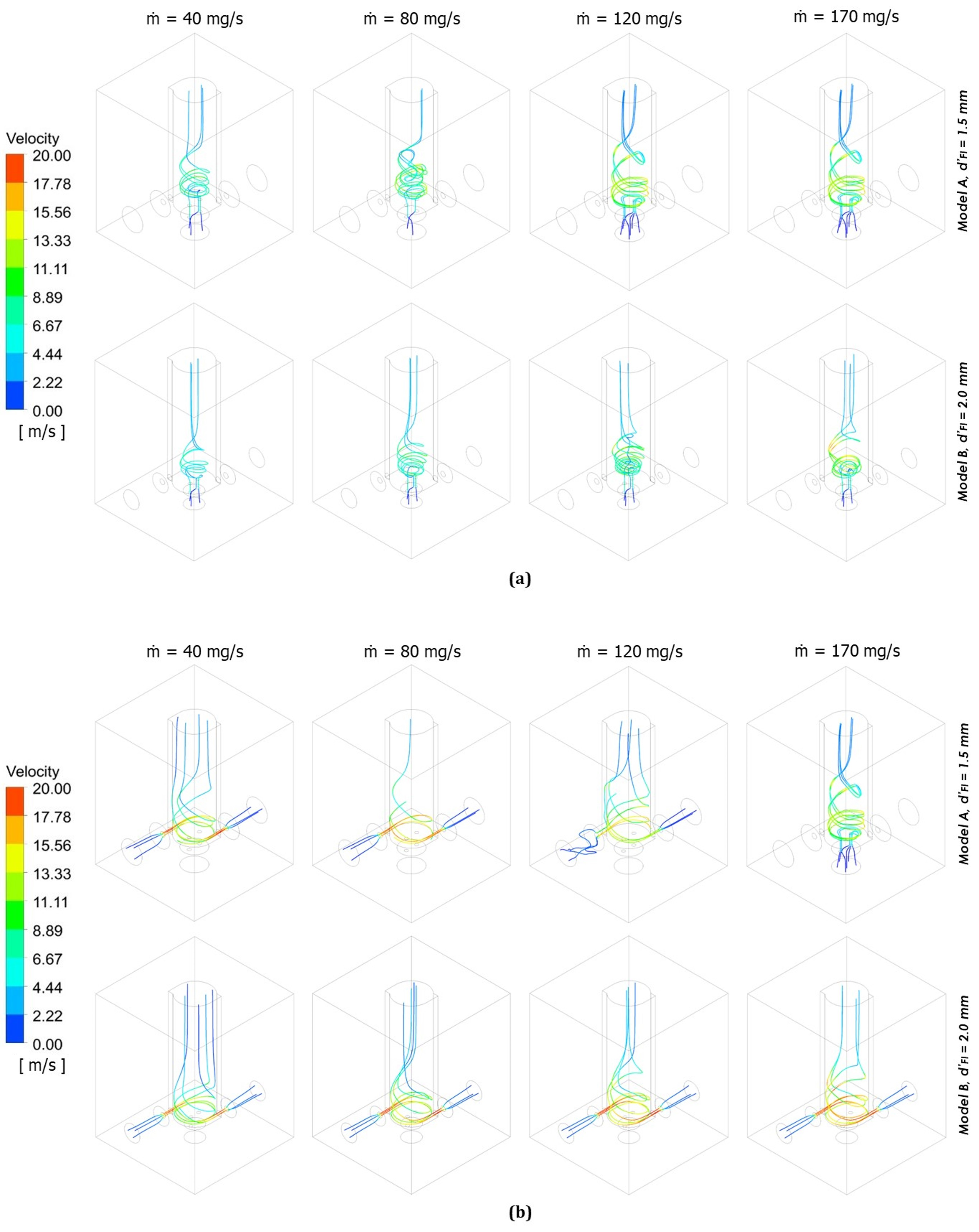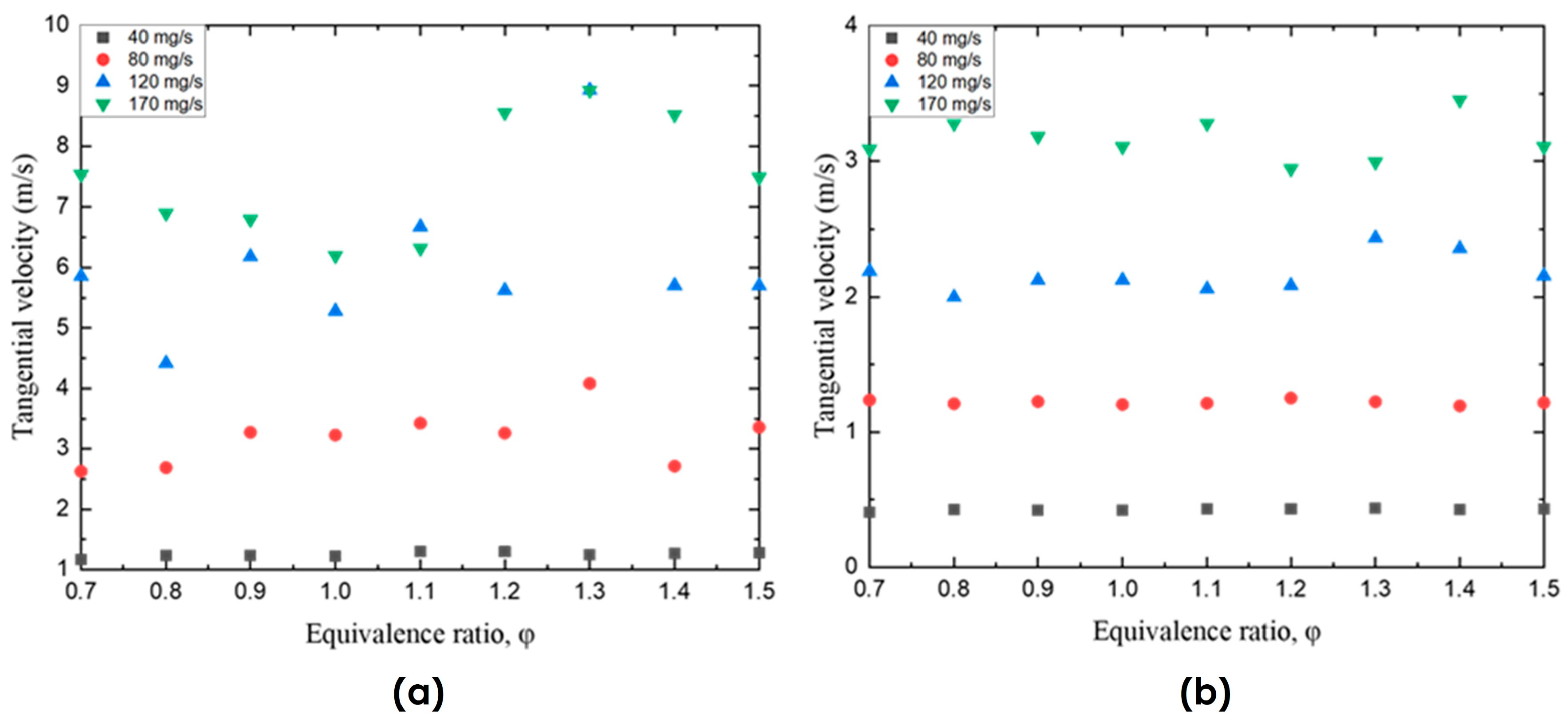Variation in tangential velocity with respect to mass flow rate of inlet air (40, 80, 120, and 170 mg/s) for (a) Model A, D = 1.5 mm and (b) Model B, D = 2.0 mm.