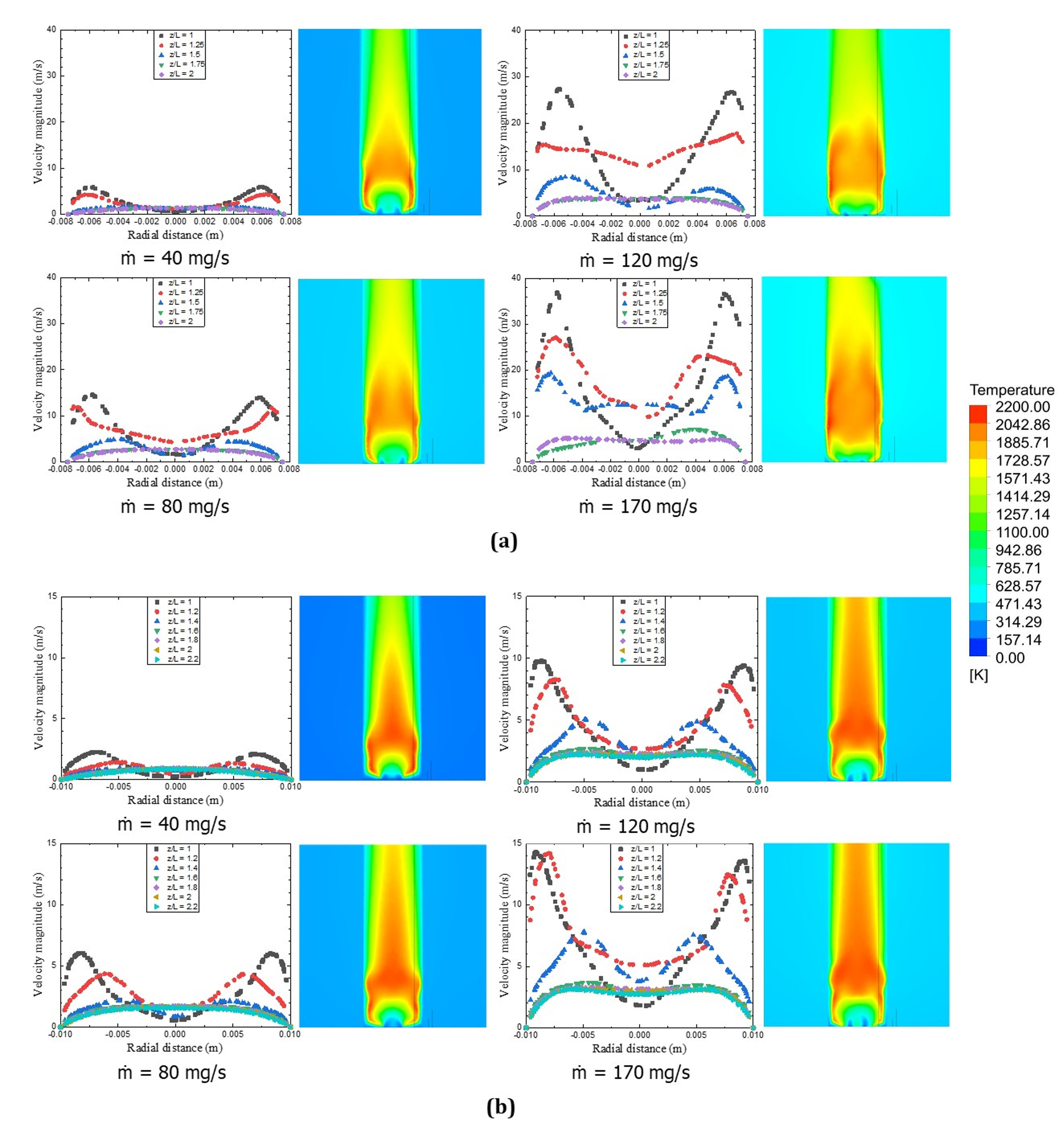Furthermore, this section presents a comparative analysis of temperature distributions in a meso-scale combustor for two fuel inlet diameters, namely 1.5 mm and 2.0 mm, under varying fuel mass flow rates ranging from 40 mg/s to 170 mg/s. The investigation was carried out through numerical simulations, with results illustrated via transverse temperature profiles at multiple axial locations (z/L = 1.0–2.2) and corresponding temperature contour plots. The observed trends provide insights into the influence of inlet geometry and mass flux on combustion characteristics, with implications for thermal efficiency, flame stability, and heat transfer behavior. At increasing