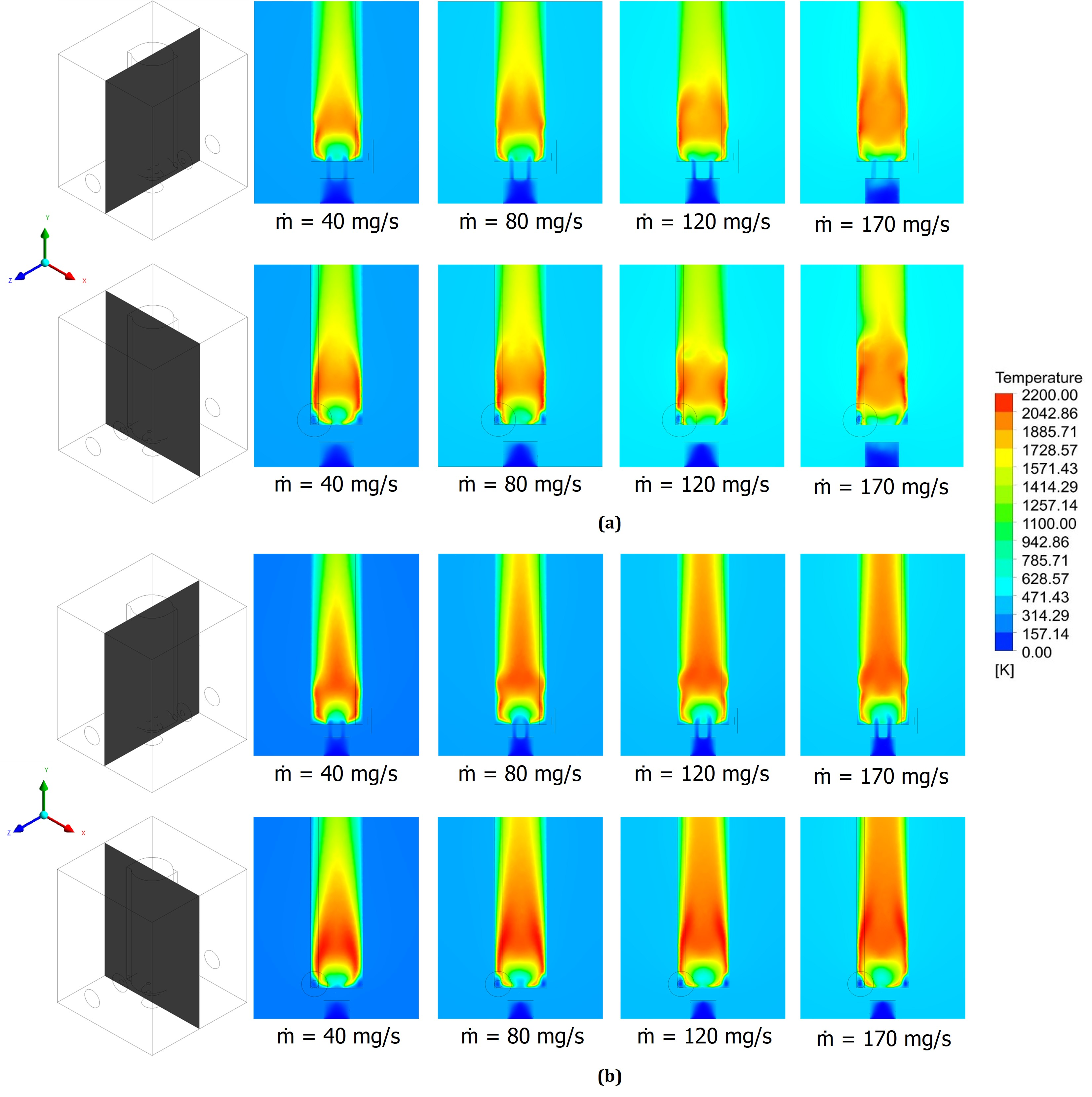 Understanding the temperature distribution within vortex-stabilized combustors is critical for elucidating the aerodynamic mechanisms that underpin flame stability [22]. Figure 8 presents two-dimensional temperature contours for a stoichiometric natural gas–air mixture under atmospheric conditions at varying inlet air mass flow rates (40–170 mg/s). As