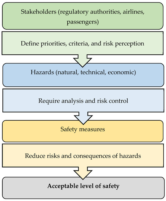 The relationship between hazards, measures, and stakeholders (Figure 1) can be viewed as a dynamic system in which hazards represent sources of risk, and measures represent the system’s responses to those risks, while stakeholders (regulators, airlines, and passengers) determine the priorities and criteria by which the measures are selected and ranked. In other words, hazards define what can go wrong, measures define what can be done to prevent it, and stakeholders define which aspects of safety are most important in the decision-making process. This tripartite relationship, where technical and operational measures are aligned with regulatory requirements and user expectations, enables a systematic approach to safety management.