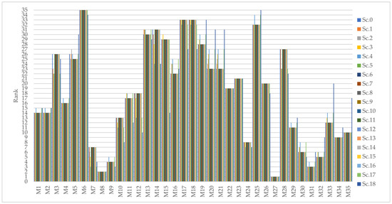 Based on the results of the sensitivity analysis of the ranking of measures across 18 scenarios, it can be concluded that the measures are consistently ranked and that the basic order is largely stable. Measure A27 consistently holds the first position (rank 1) in all scenarios, indicating its highest effectiveness and stability. Similar stability is shown by measures A8 and A31, which occupy very low ranks with minimal deviations, while measure A35 is relatively low-ranked in all scenarios, indicating its lower effectiveness compared to other measures.