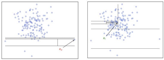 The Isolation Forest (iForest) algorithm is an ensemble-based anomaly detection approach that draws its conceptual foundation from Random Forest methodology []. It has been successfully applied to diverse domains, including industrial monitoring [] and network security []. The efficiency of the Isolation Forest algorithm stems from a core principle regarding anomalies: they are both infrequent and significantly different from normal data points. So, when a dataset is recursively partitioned, such anomalies require fewer steps to be isolated from other observations []. This process, visualized in Figure 4, demonstrates that an anomalous point (), being distant from the dense cluster, is isolated with only four partitions. In contrast, a normal point (), deeply embedded within the data, requires ten partitions for full isolation [,].