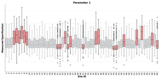 The most commonly used approach for detecting site-to-site variation is visual inspection of boxplots for each measured specification. Operators manually scan these plots for sites whose medians or quartiles appear shifted or distorted relative to the ensemble, as illustrated in Figure 1. Although this qualitative analysis can be effective under specific conditions, its primary drawbacks are that it lacks a systematic process and requires manual analysis. Consequently, the technique does not scale well, becoming increasingly labor-intensive and susceptible to human error as the number of sites and parameters grow.