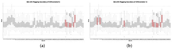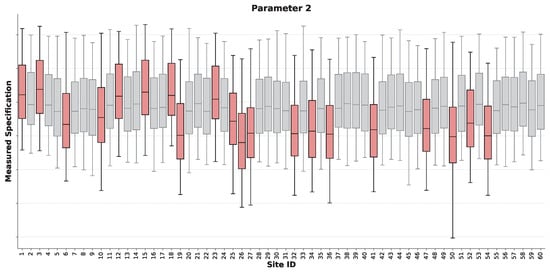 Boxplot validation for parameter 2. The sites flagged by the framework (highlighted in red) consistently show a systematic downward shift in their median value, indicating a location-based anomaly.