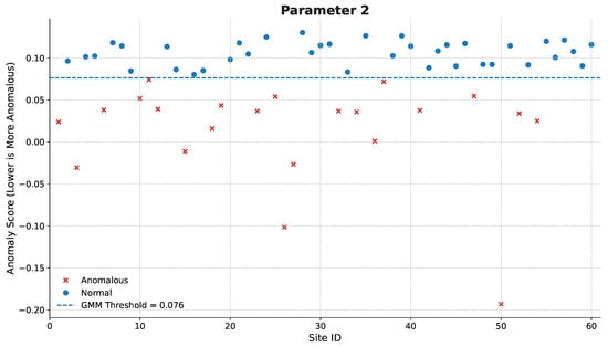 Anomaly scores for each site corresponding to the parameter 1 data. The decision boundary derived by the GMM is shown as a dashed line. Sites with scores exceeding this threshold are classified as anomalous.