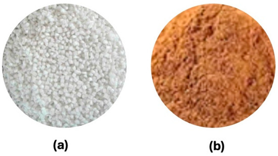 (a) PP pallets (2.5–3.0 mm size) and (b) CS fiber in powder (80 mesh size).