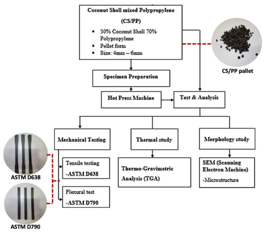 The husk of a coconut and the flesh are separated by the coconut shell (CS). Figure 1a illustrates the virgin PP thermoplastic granules supplied by a Chinese manufacturer (Chi Mei Corporation, Tainan, China) with MFI 3.6 g/10 min, whereas Figure 1b depicts CS fiber in powder form with an 80-mesh size. Figure 2 shows a flowchart of the research methodology for CS/PP composites. To remove the unwanted soluble cellulose, lignin, hemicellulose, and moisture, the CS was immersed in water for two days and in a sodium hydroxide (NaOH) solution for two hours. It then spent a day drying in the sun. An amount of 30 wt% of CS and 70 wt% of PP was used to create the CS/PP composite. Pre-mixing with a high-speed mixer set to 3000 rpm for five minutes was the next step. Gotech hot press machines with specialized molds were utilized to obtain tensile and flexural samples in compliance with ASTM D638 [22] and ASTM D790 [23]. The CS/PP composite was hot-pressed for 30 min at 240 °C, and virgin PP was hot-pressed for 20 min at 160 °C. Hot-press compression molding was selected due to its suitability for incorporating natural fibers into the thermoplastic matrix. Compression molding allows better control over fiber distribution, minimizes fiber degradation caused by high shear stresses in injection molding, and is more cost-effective for small-scale experimental work. Additionally, this method is frequently reported in the literature for fabricating natural fiber-reinforced thermoplastic composites, making it an appropriate choice for the scope of this study. The next methods performed were the mechanical testing (tensile and flexural), thermal testing, and microstructure evaluation.