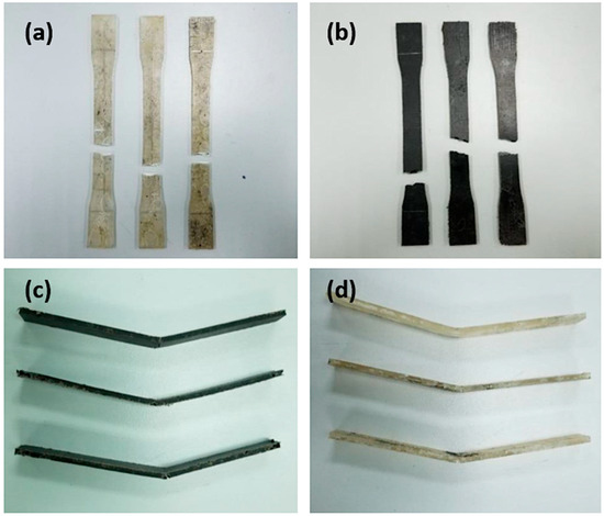 Mechanical test specimens for (a) pure PP—tensile, (b) CS/PP composite—tensile, (c) CS/PP composite—flexural, and (d) pure PP—flexural.
