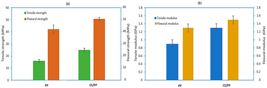 (a) Tensile strength and flexural strength, and (b) tensile modulus and flexural modulus of PP and CS/PP composite.