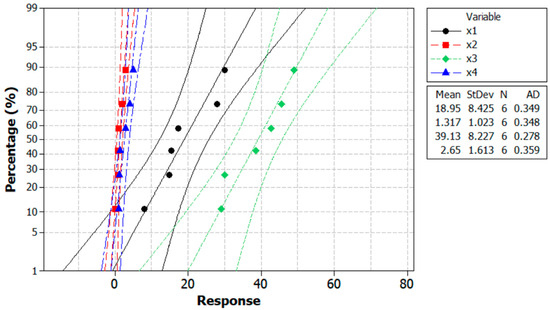 Probability graph of x1 is tensile strength, x2 is tensile modulus, x3 is flexural strength, and x4 is flexural modulus.