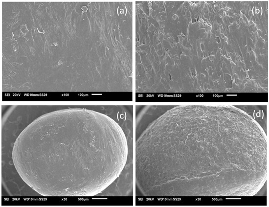 SEM micrograph of (a) pure PP, magnification of 100 µm, (b) CS/PP composite under 100 µm magnification, (c) pure PP, magnification of 500 µm, and (d) CS/PP composite, magnification of 500 µm.