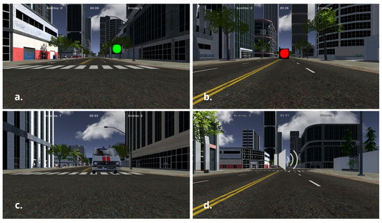 Currently, there are several tests that are developed for people to obtain a driver’s license; among these are the theoretical test on knowledge of traffic laws and the psychometric evaluation that allows for the evaluation of the reaction capacity of drivers when subjected to audiovisual stimuli [53,54,55]. Therefore, the present study has been developed using a combination of advanced technologies to create a psychometric test based on VR. For the implementation of this system, devices and tools were selected that allowed for the creation of an immersive and controlled environment, suitable for evaluating different psychomotor and sensory skills of users.