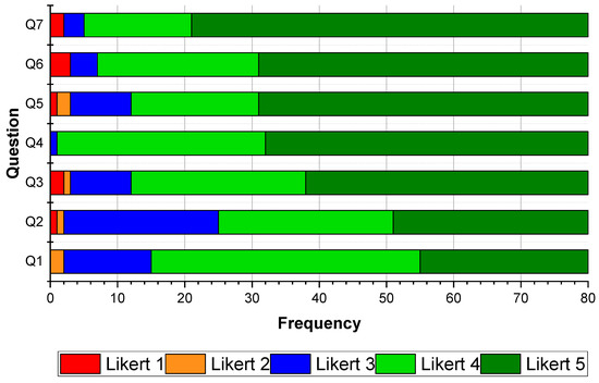 After carrying out the tests with the users, a survey was carried out to determine the functionality and the level of satisfaction with the virtual environment. In the following subsections, the questions included in the user acceptance survey and the corresponding statistical results are presented in detail. To provide an overview, Figure 4 illustrates the general scheme of the results, highlighting the distribution of responses across the main evaluation dimensions. This figure serves as a visual summary that complements the descriptive statistics and helps contextualize the trends identified in the survey data.