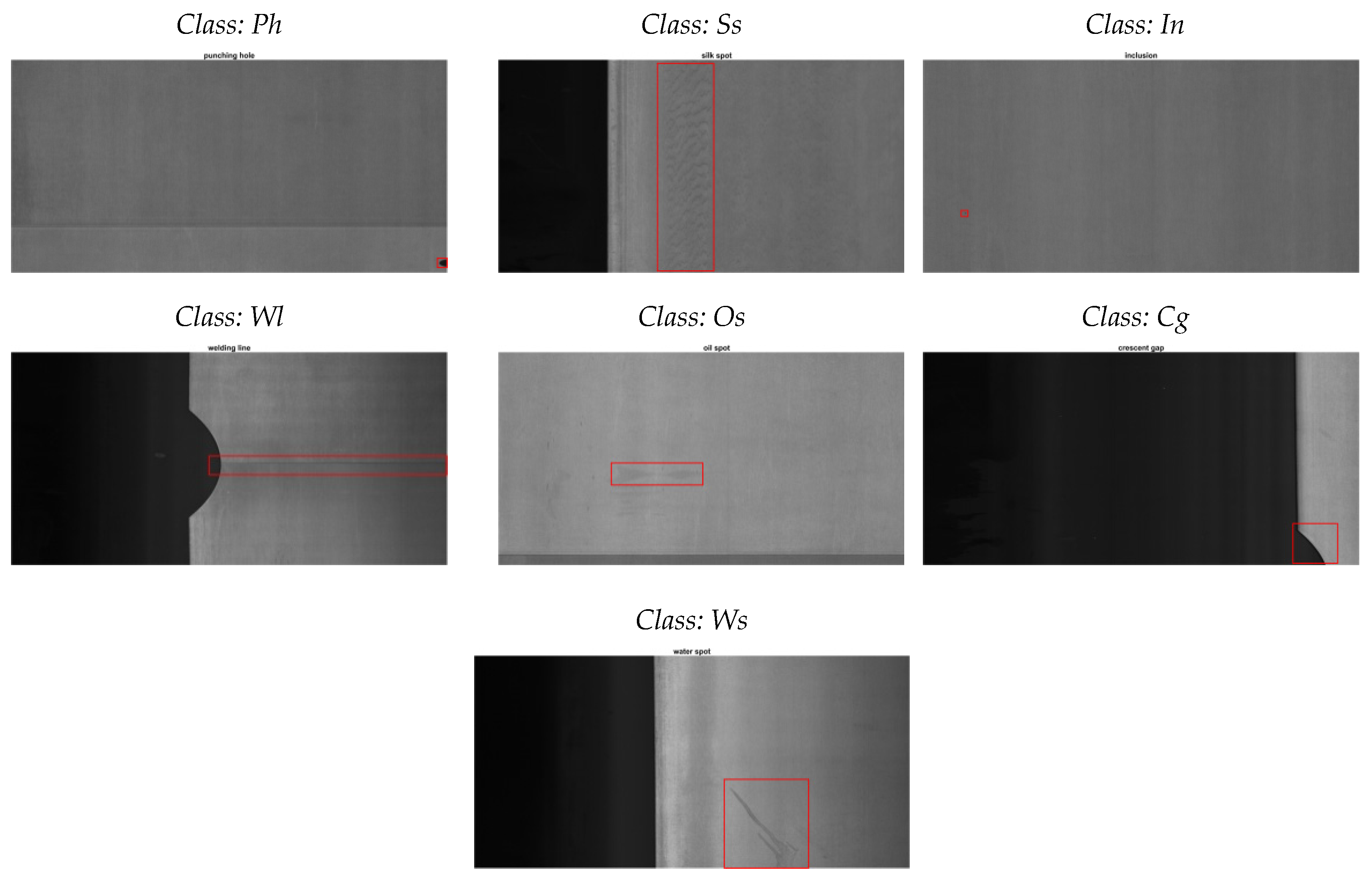 45]. The fault types detected and classified by the deep learning model are the Punching hole (Ph), Welding line (Wl), Crescent gap (Cg), Water spot (Ws), Oil spot (Os), Silk spot (Ss), and Inclusion (In).
