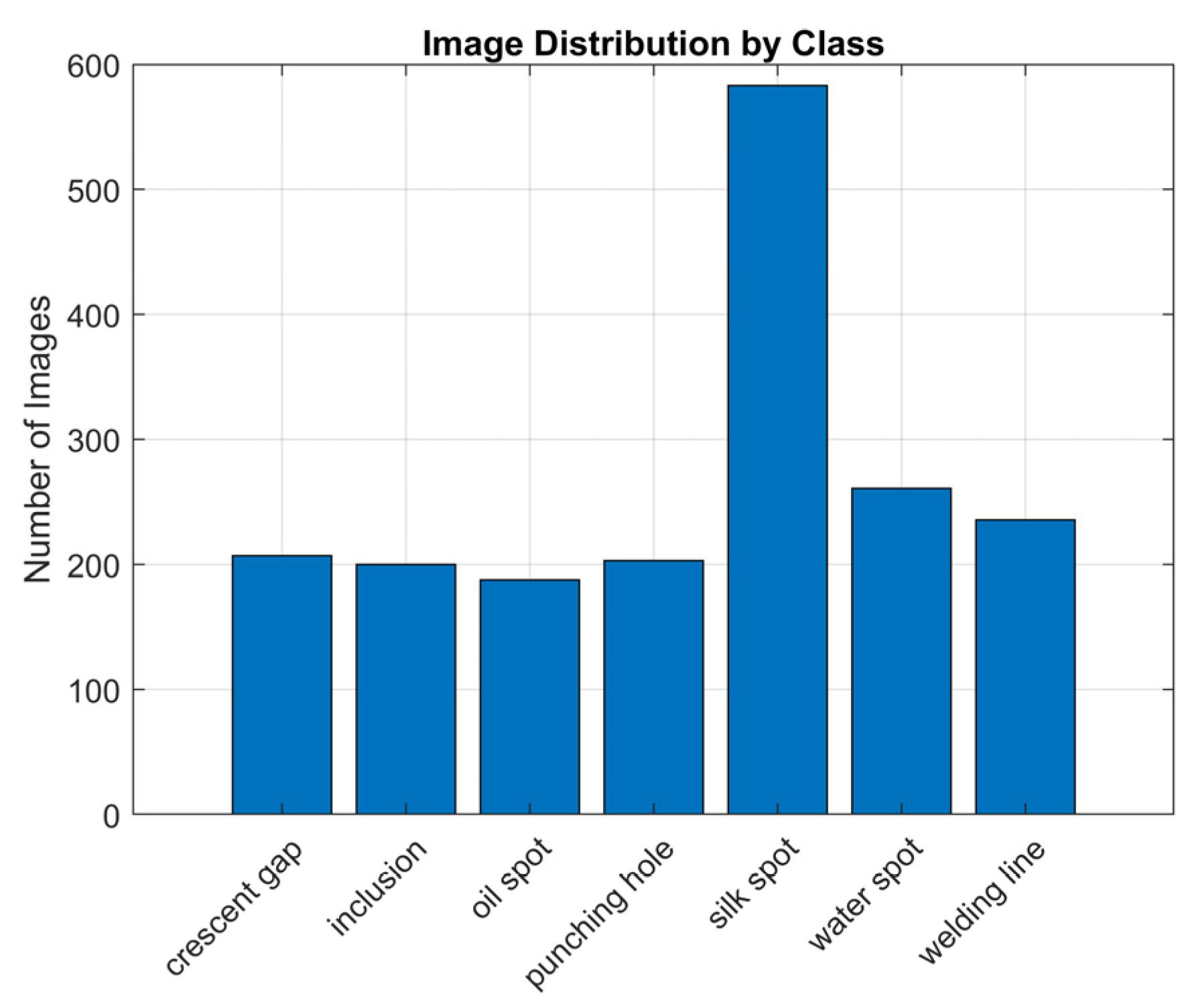 Figure 2, it can be seen that the dataset exhibits significant class imbalance, with silk spot representing 31% of all images, while oil spot or welding line constitutes only 10%.