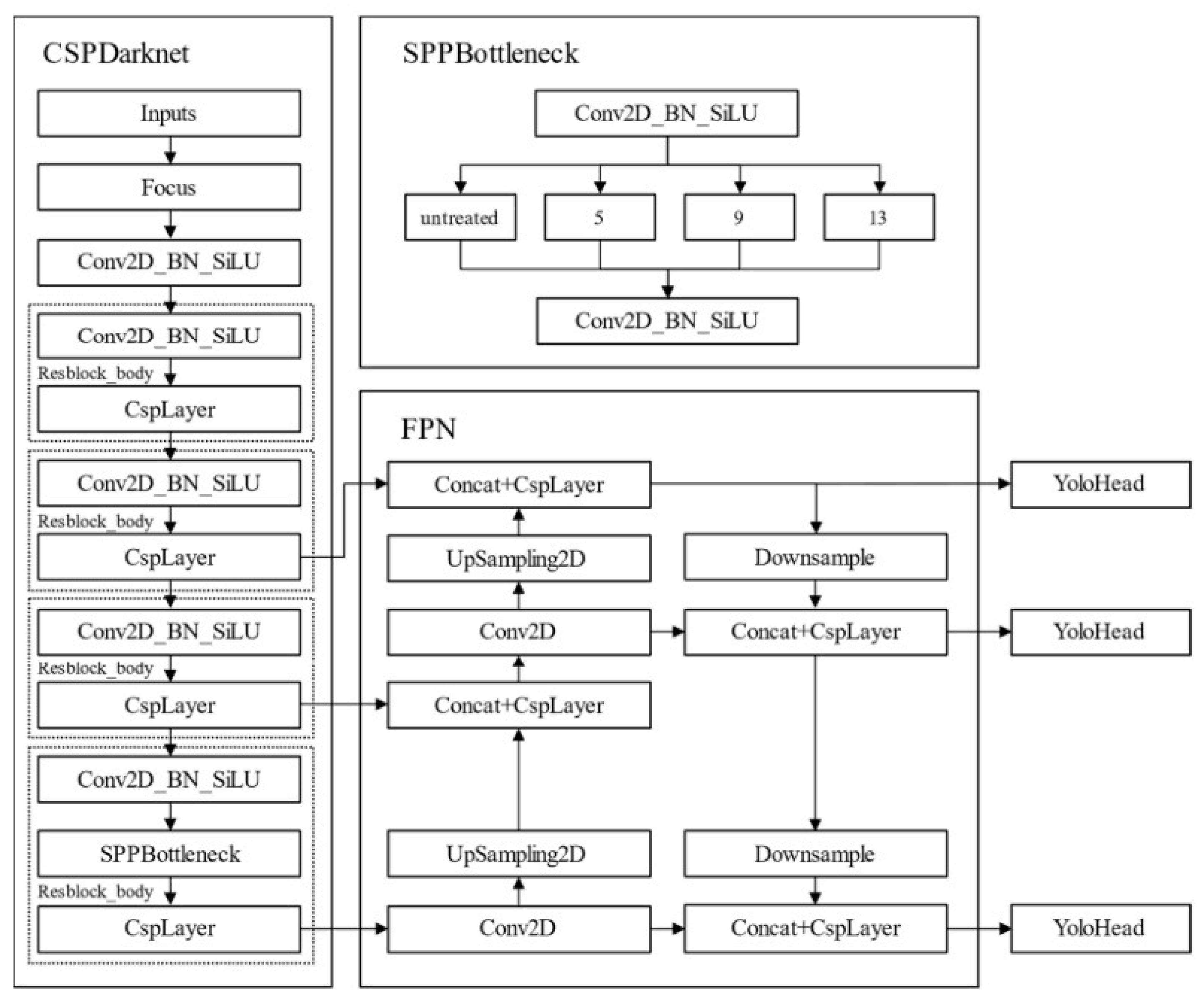 The backbone feature extraction network is the CSPDarknet network that uses a residual network architecture to initially extract feature layers of various sizes from the input image. In this network, there exists a large number of ordinary convolutions. In the feature-extraction network model, deeper layers contain richer semantic features; consequently, location information has been highly abstracted into semantic information. The YOLOX-Tiny utilizes the SPPBottleneck module, positioned between the convolutional layer and the CspLayer, to increase the model’s receptive field in the deep network while avoiding image distortion that often results from operations like cropping and scaling. The SPPBottleneck module processes the input data in parallel using maximum pooling layers of different sizes (5, 9, and 13), performing fusion afterward. This approach reduces the number of parameters, removes redundant information, and addresses the multi-scale problem of target detection. The output of the last three CspLayer in the CSPDarknet enters in the Feature Pyramid Network (FPN) module to achieve feature fusion and obtain significant contextual features. In the FPN, the bottom-up and top-down paths are fused. The high-level features are then transmitted and combined using UpSampling2D. Finally, the predicted feature maps are obtained by down-sampling, which enhances the characterization of the backbone feature extraction network. The predicted feature maps of the FPN are input into the Yolo Head detection. The Yolo Head consists of Conv2D_BN_SiLU convolution modules. It starts with a 1 × 1 convolution layer to reduce the feature channel (to 256) and then adds two parallel branches, each with two 3 × 3 convolution layers. Using a large number of convolutions in the YOLOX-Tiny detection head increases the model’s complexity, but also improves its detection accuracy. The branch outputs include predictions for object type classification (Cls), regression (Reg) for the prediction box’s location, and objectness (Obj) that indicates the coordinates of the prediction box (