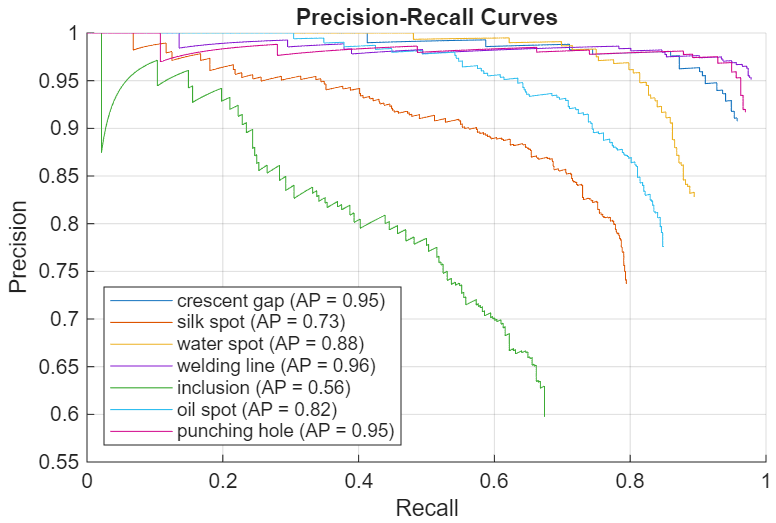 Figure 6. The area under the P-R curve represents the AP value for each defect type, and a larger area means a larger AP value of the model. It can be seen from the test results that a higher area under the curve was obtained in the punching hole, welding line, and crescent gap defects with an AP value of 0.953%, 0.964%, and 0.947%, respectively.