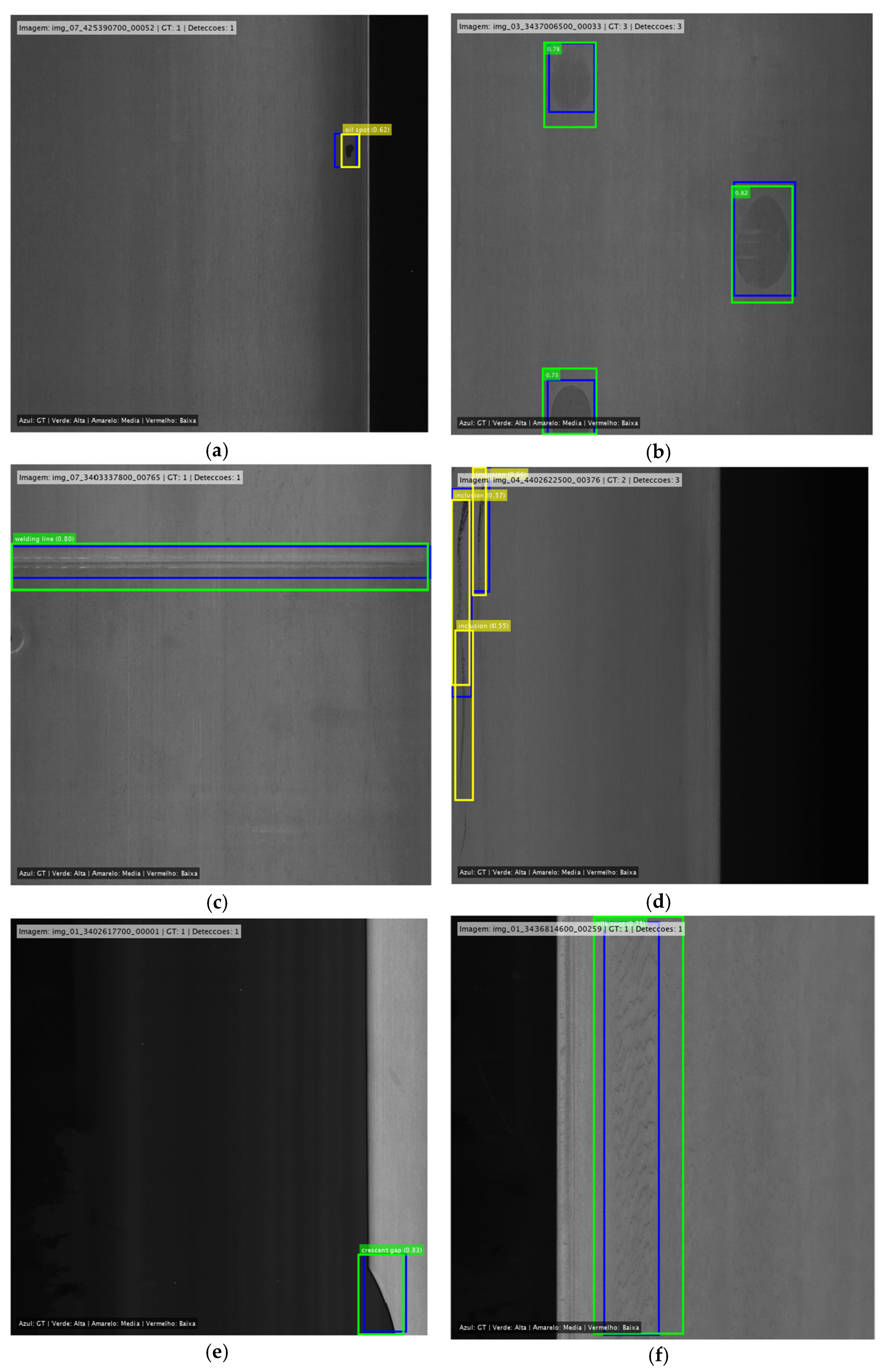 Figure 7b,d, it is possible to verify the presence of a defect in more than one location in the image (blue bounding boxes), with the proposed model detecting it for each location (green or yellow bounding boxes).