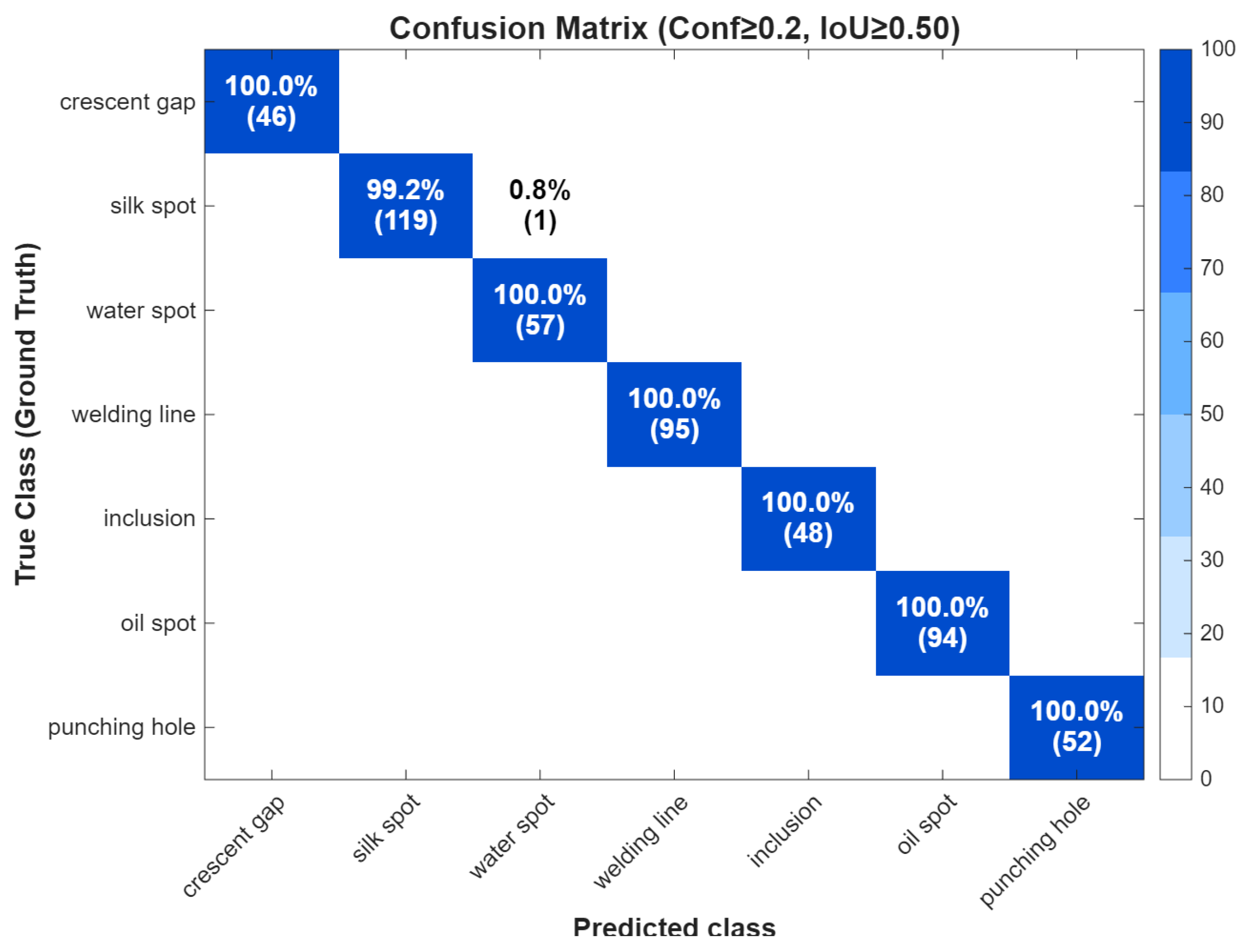 Table 2). From the results presented in the confusion matrix for an IoU ≥ 0.5, it can be seen that the proposed model has difficulty only classifying the type of silk spot defect, occasionally confusing it with the type of water spot defect.