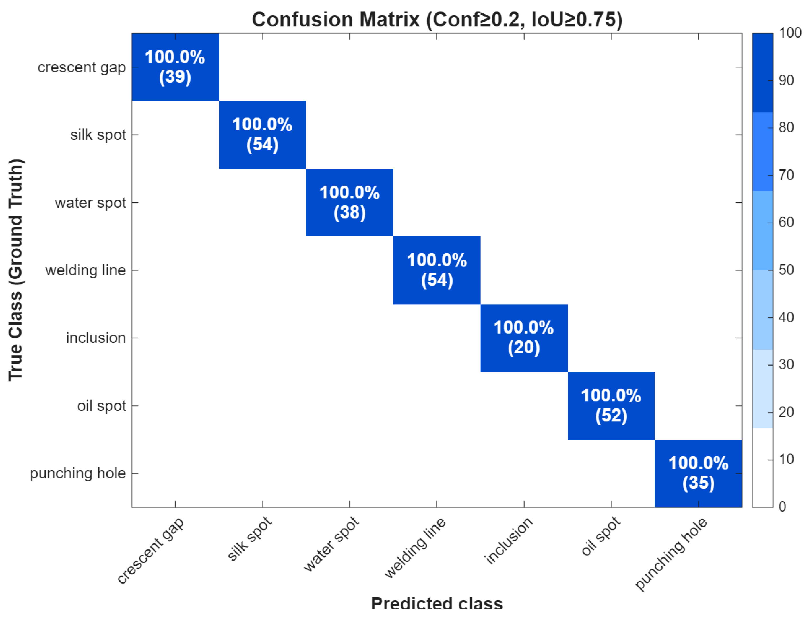 Figure 9’s confusion matrix shows that the total number of defect detections made by the model (292) is smaller than the previous count, given the 569 total defects in the test images. For an IoU ≥ 0.75, the confusion matrix indicates that, among successful detections, the model had no difficulty identifying the seven defect types. The defect shown in